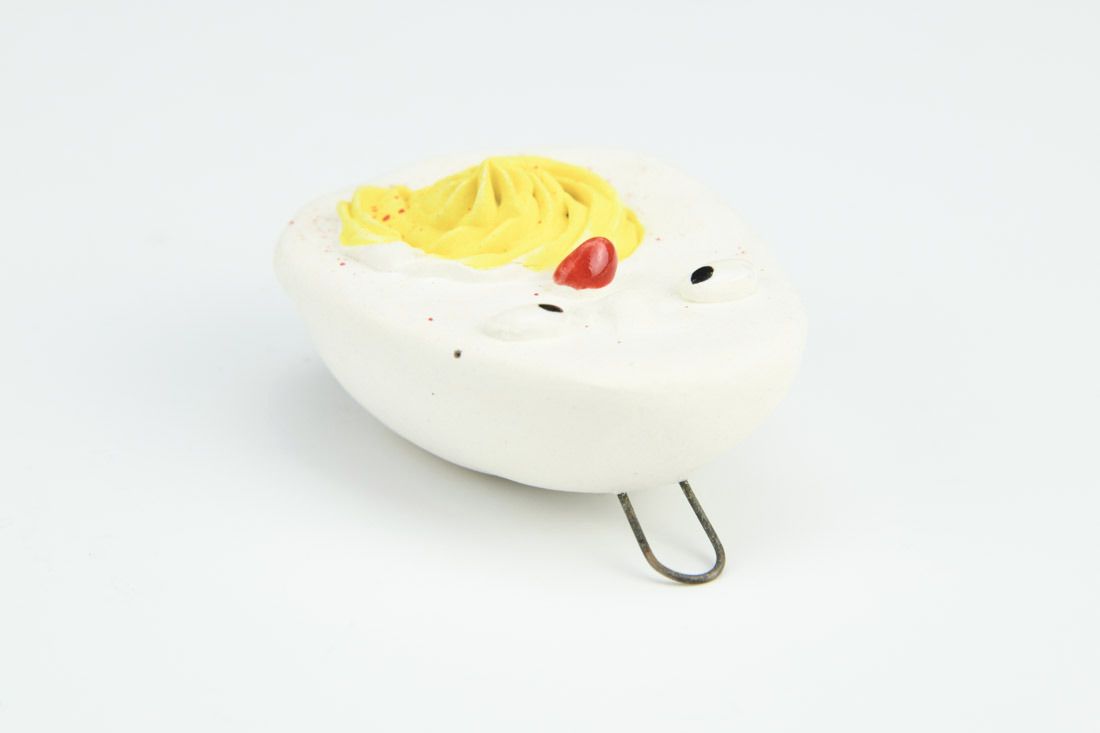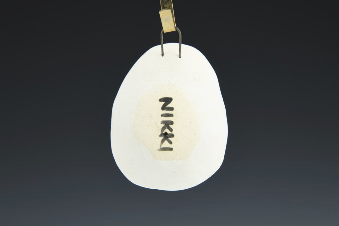 B-mix with nichrome wire, hand built, underglaze, glaze, mid-range electric fired, 2 x 1.5 x 0.75 inches. Please note: gold hook on which egg is hanging is not included.