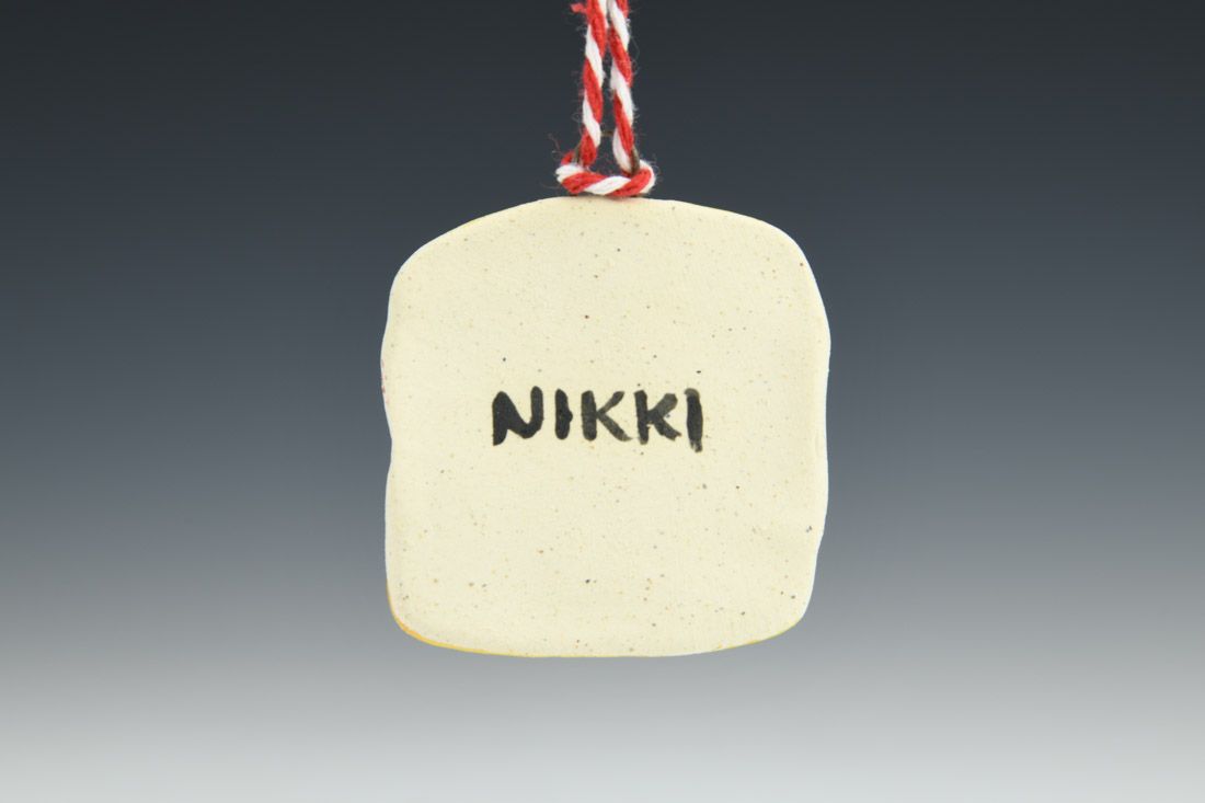 B-mix with nichrome wire and cord, hand built, underglaze, glaze, mid-range electric fired, 1.75 x 1.75 x 0.25 inches.