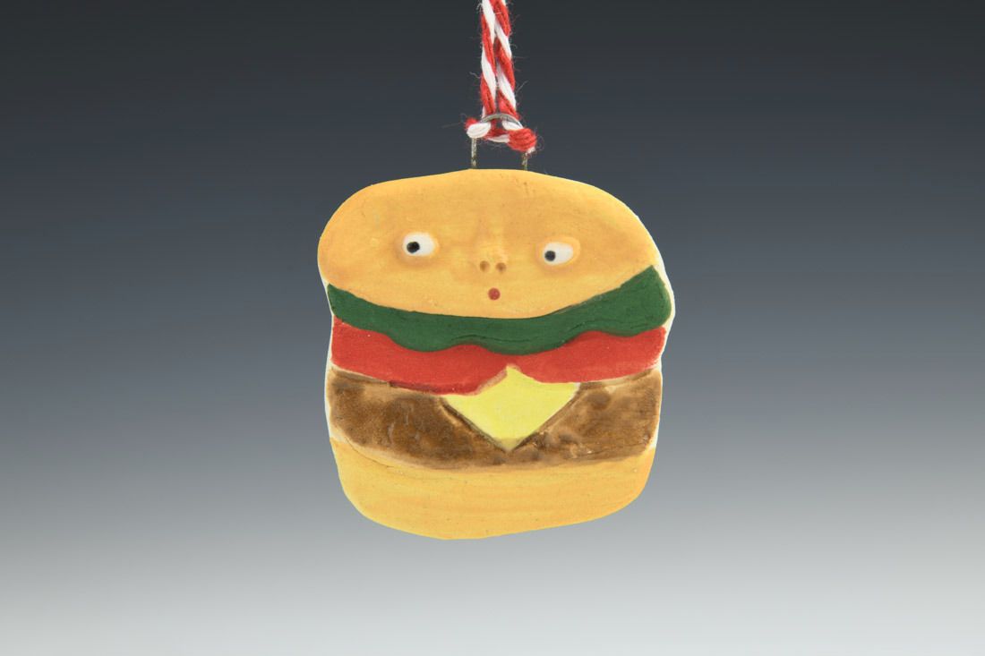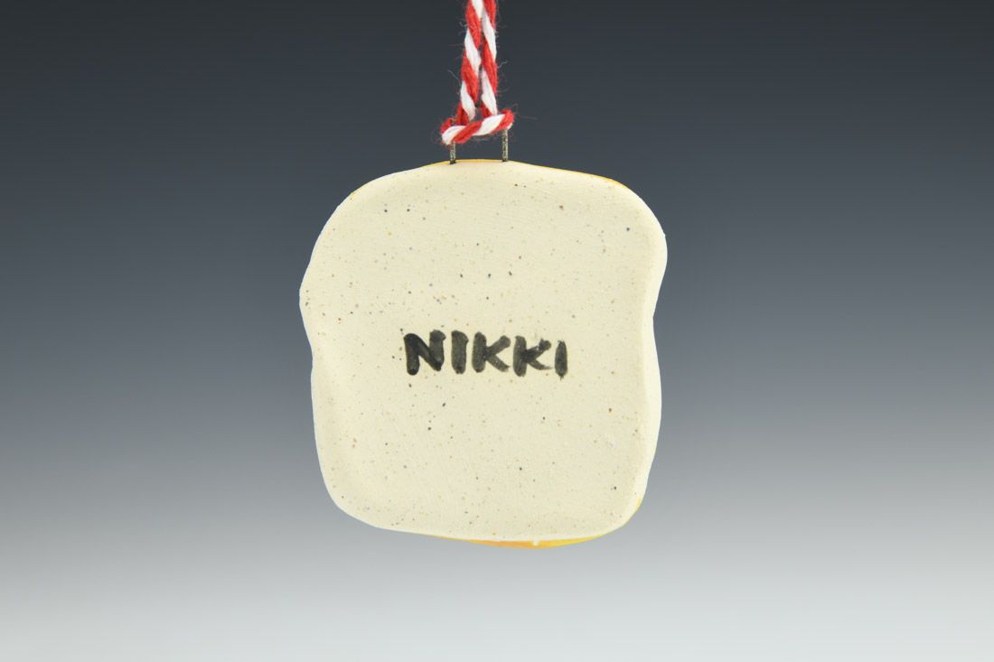 B-mix with nichrome wire and cord, hand built, underglaze, glaze, mid-range electric fired, 1.75 x 1.75 x 0.25 inches.