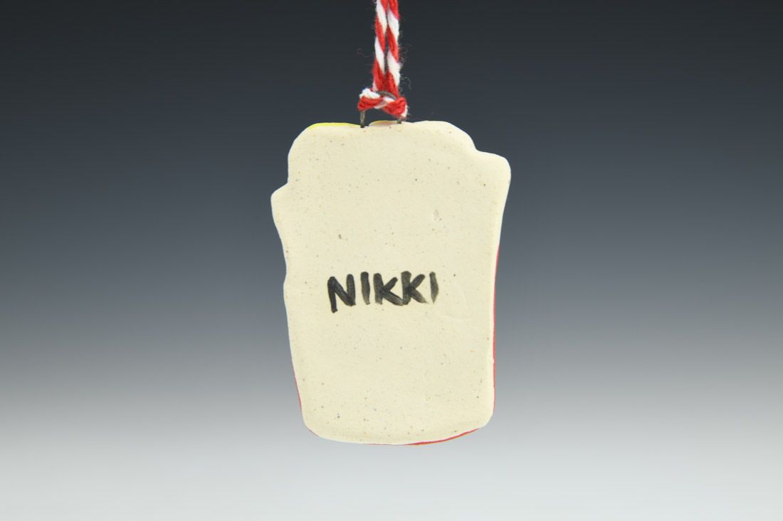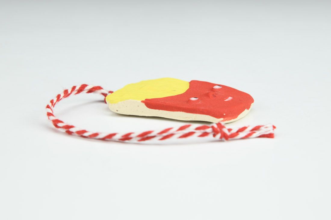 B-mix with nichrome wire and cord, hand built, underglaze, glaze, mid-range electric fired, 2 x 1.5 x 0.25 inches.
