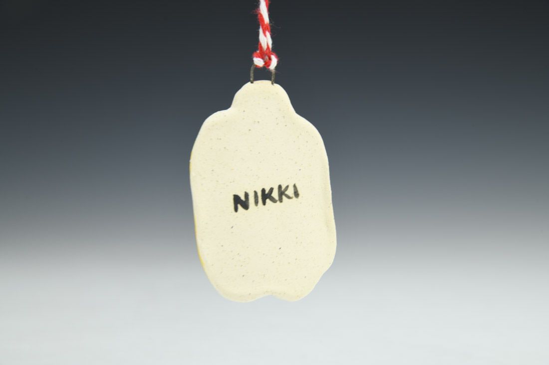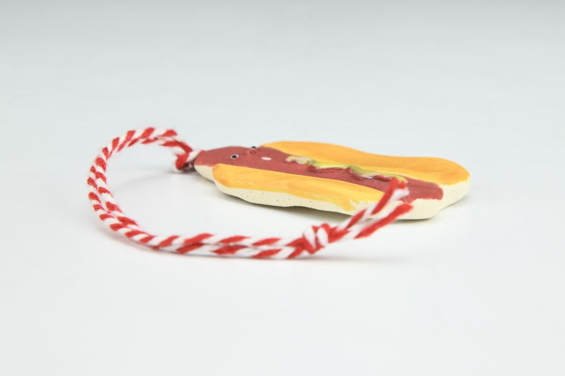 B-mix with nichrome wire and cord, hand built, underglaze, glaze, mid-range electric fired, 2.5 x 1.75 x 0.25 inches.
