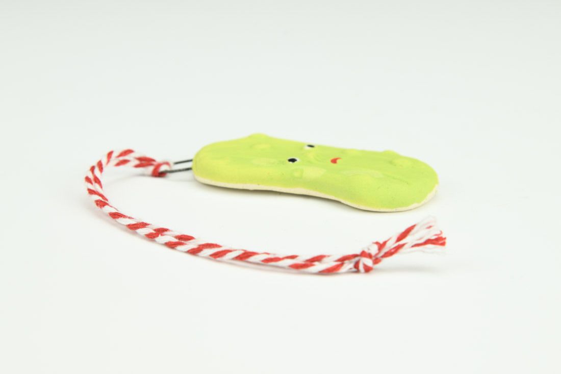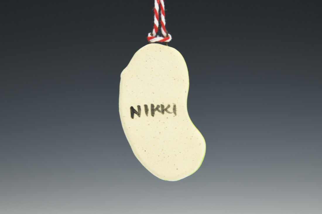 B-mix with nichrome wire and cord, hand built, underglaze, glaze, mid-range electric fired, 2 x 1 x 0.25 inches.