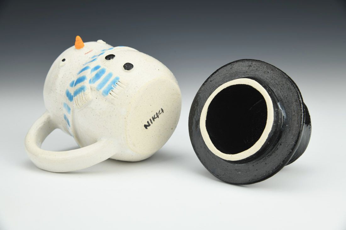 White stoneware, hand built, underglaze, glaze, mid-range electric fired, 5.25 x 5 x 3.75 inches.