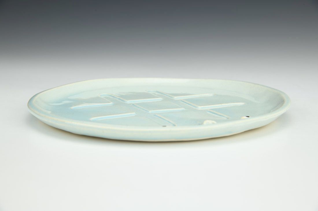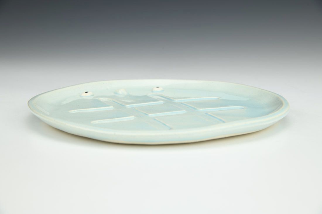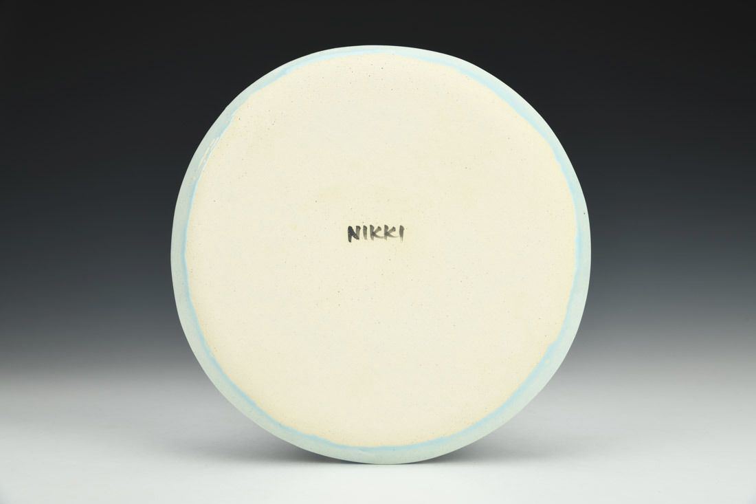 Stoneware, hand built, underglaze, glaze, mid range electric fired, 7 x 7 x 0.5 inches.