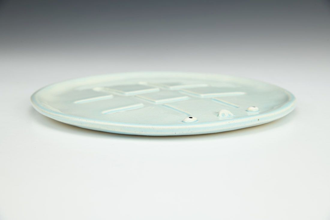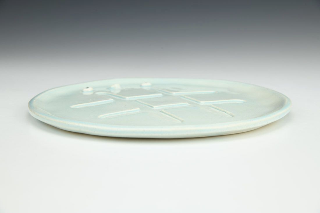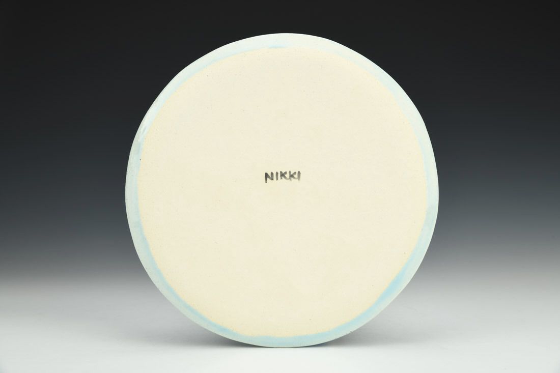 Stoneware, hand built, underglaze, glaze, mid range electric fired, 7 x 7 x 0.5 inches.