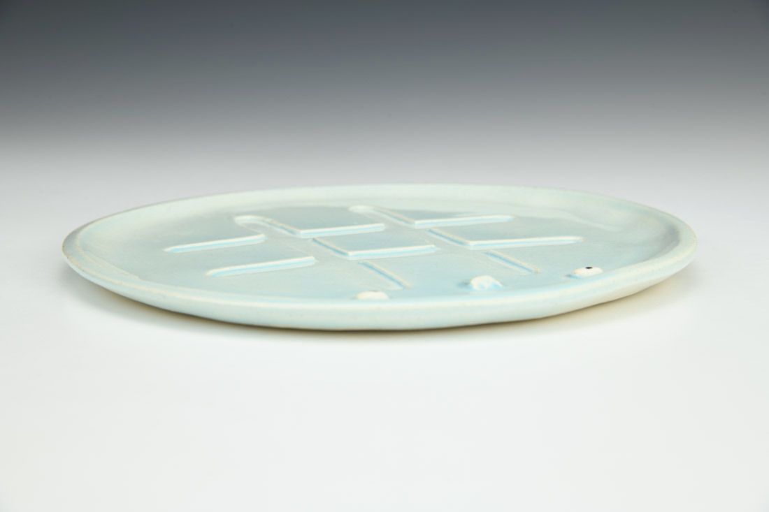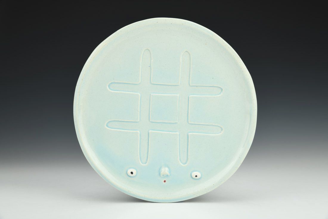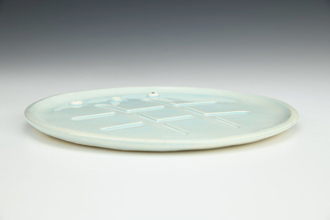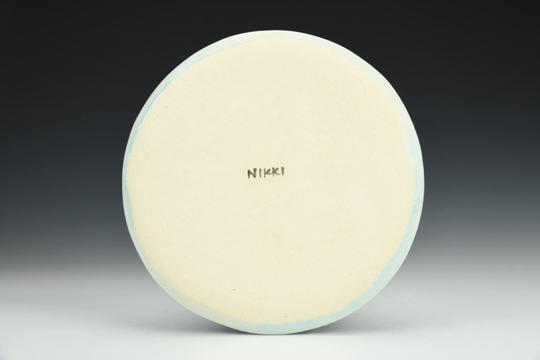 Stoneware, hand built, underglaze, glaze, mid range electric fired, 7 x 7 x 0.5 inches.