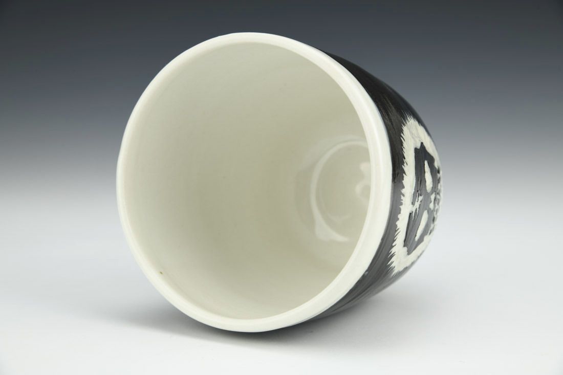 Porcelain, wheel thrown, sgraffito, black slip, glaze, cone 10 oxidation fired, 3.5 x 4 x 4 inches.