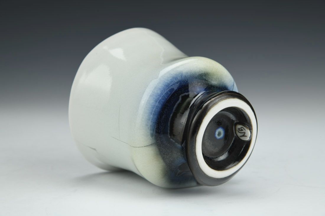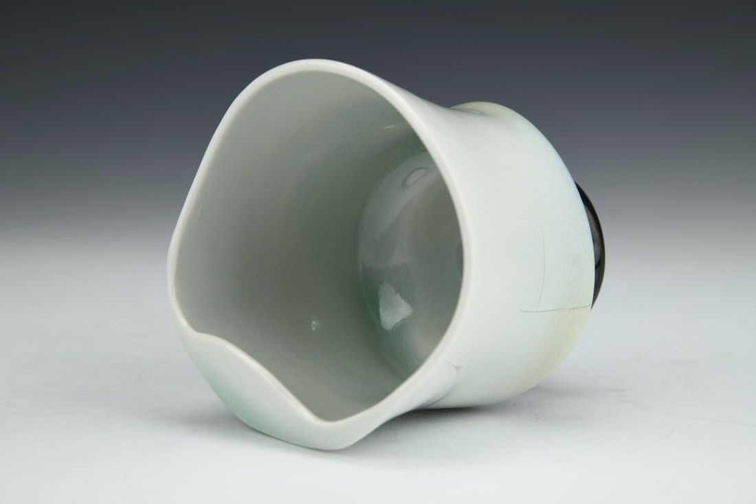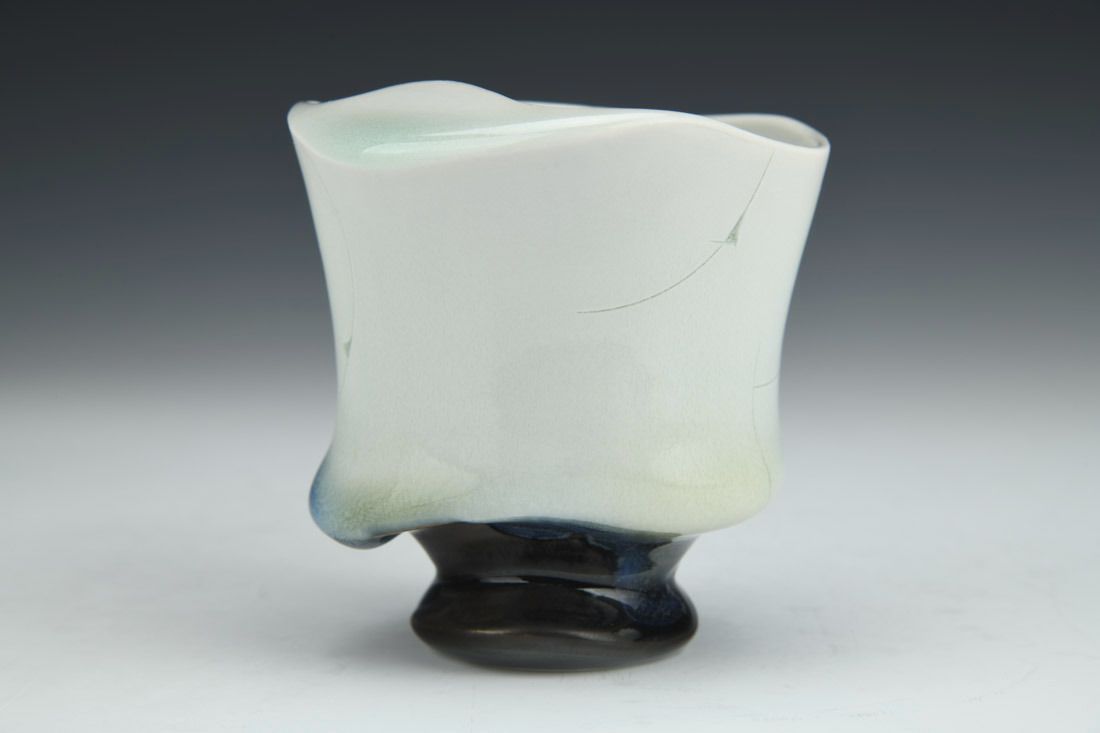 Porcelain, wheel thrown, cone 10 reduction fired, 4 x 3.75 x 3.5 inches.