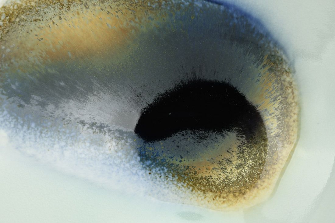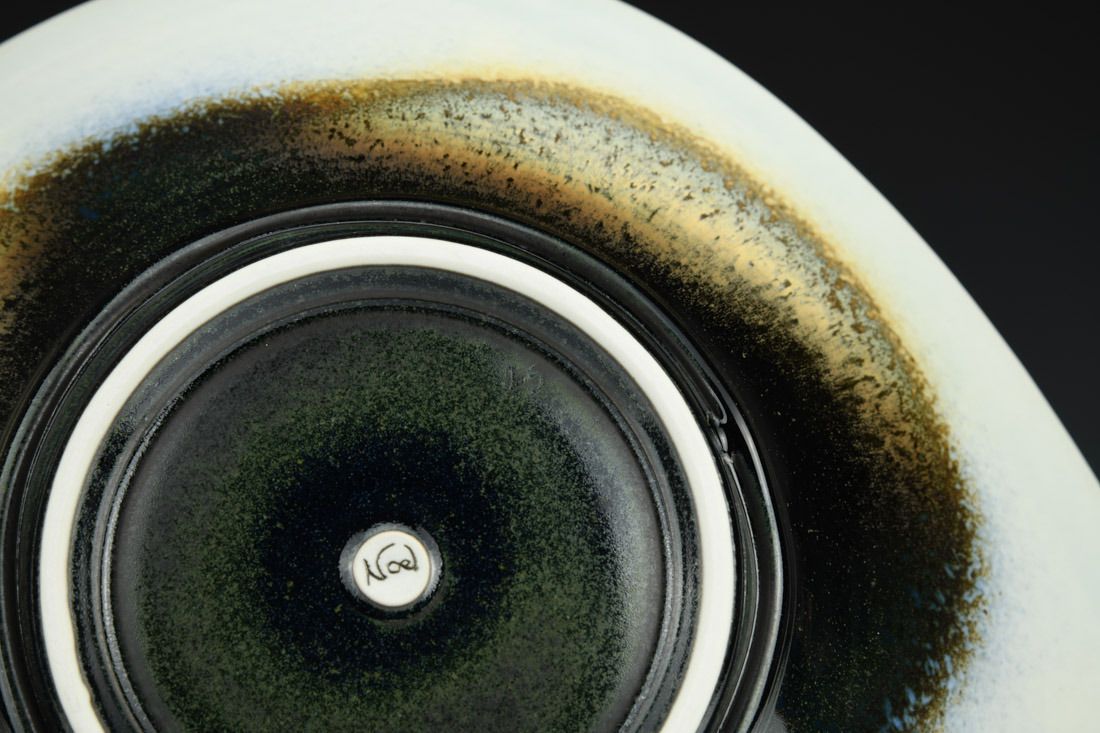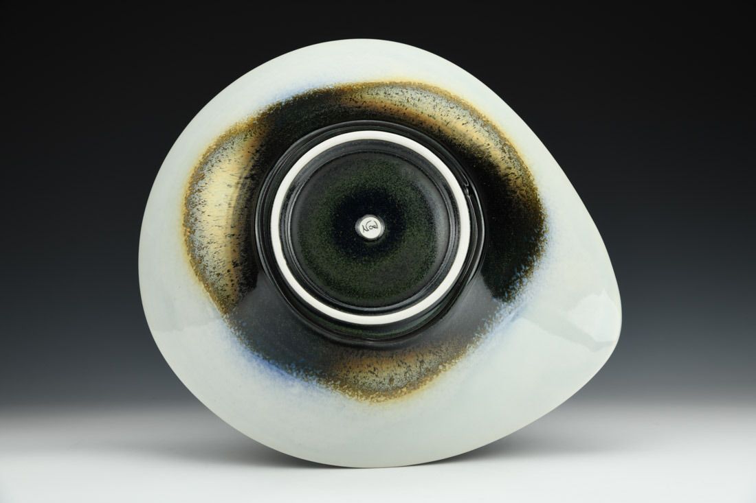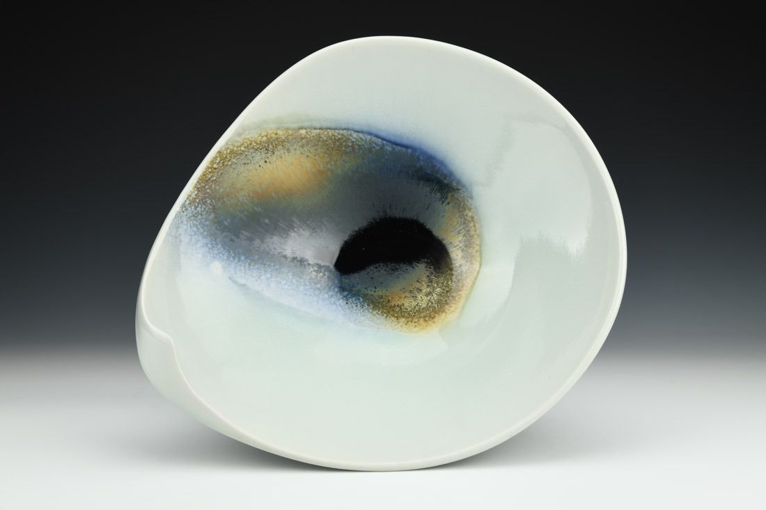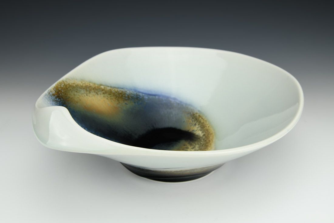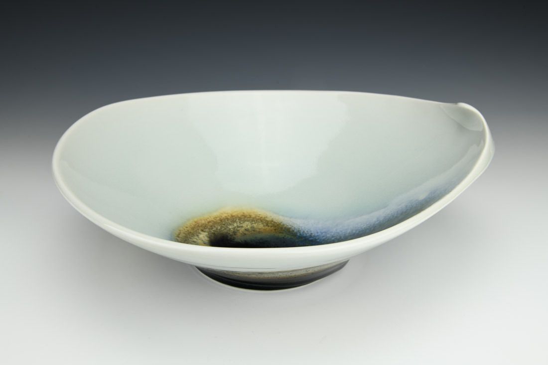 Porcelain, wheel thrown and hand built, cone 10 reduction fired, 5 x 14 x 12.5 inches.