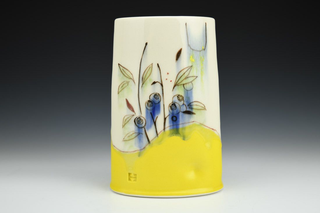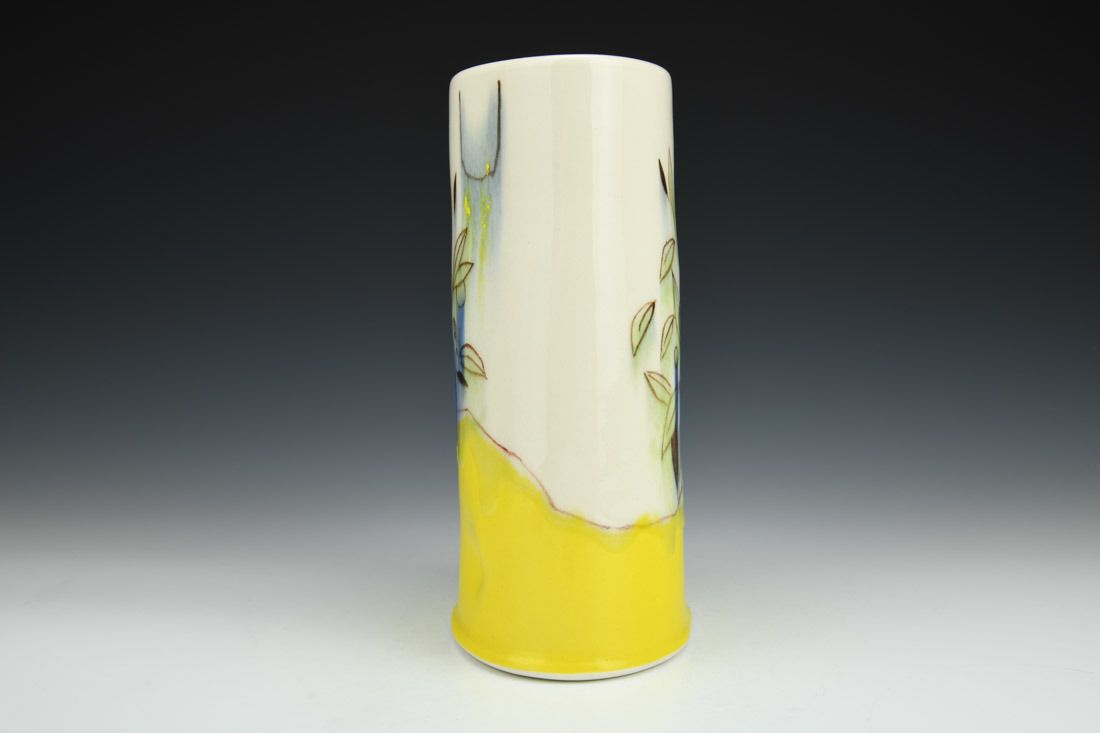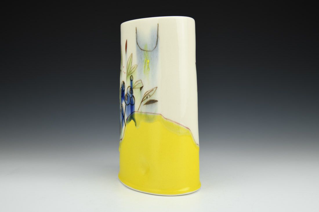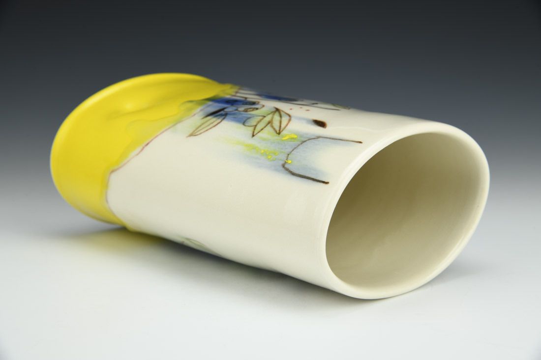 Porcelain, wheel thrown, hand painted, underglaze, glaze, cone 6 oxidation fired, 8.25 x 5 x 3.25 inches.