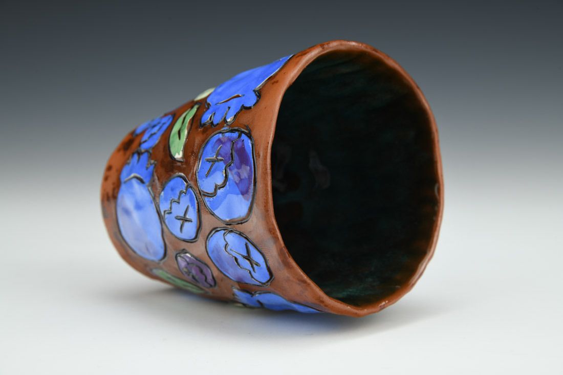 Earthenware, hand built, underglaze, glaze, borax washed, electric fired, 3.75 x 3.5 x 3.5 inches.