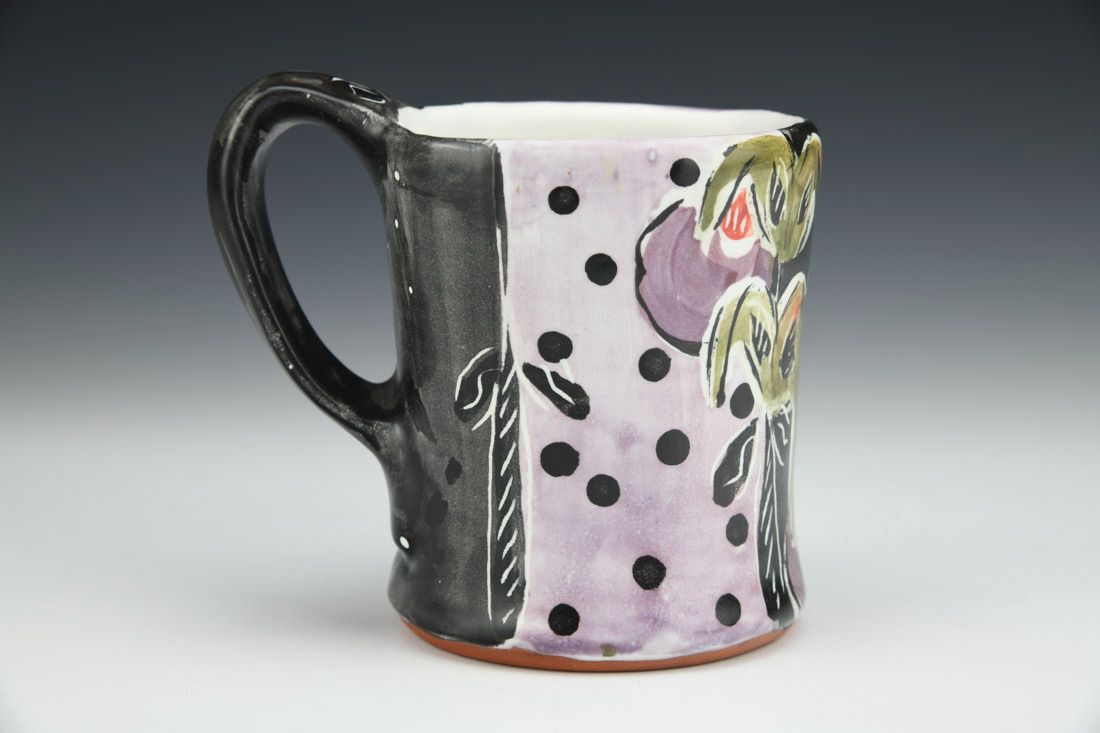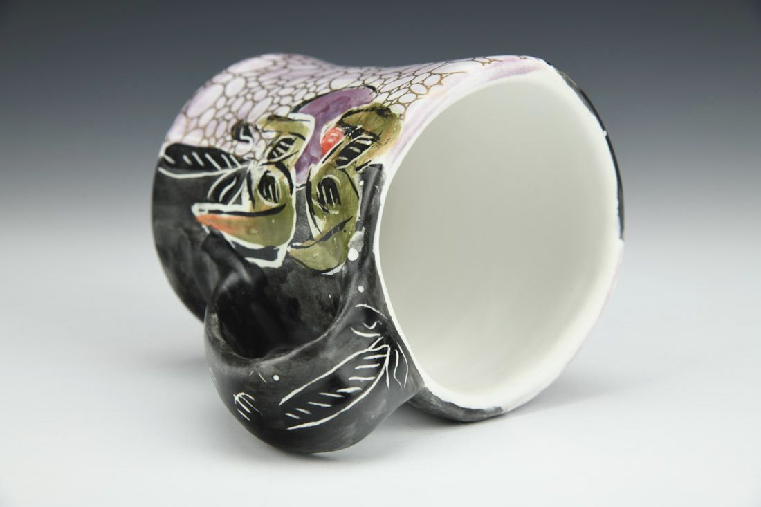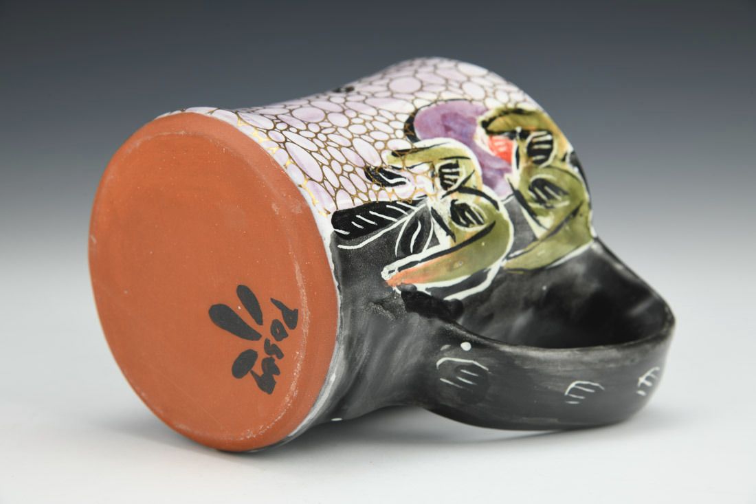 Terra cotta, wheel thrown and altered, majolica, gold decal, cone 04 electric fired, 4.5 x 5 x 3.5 inches.