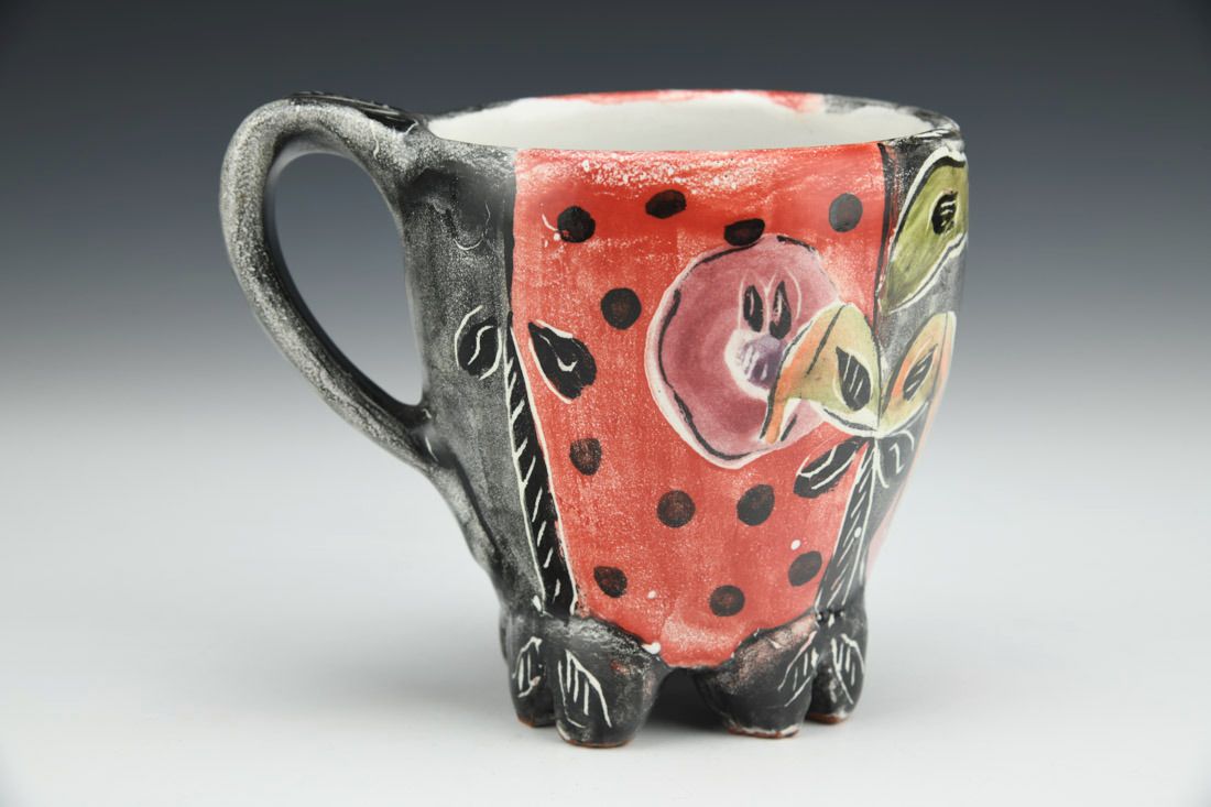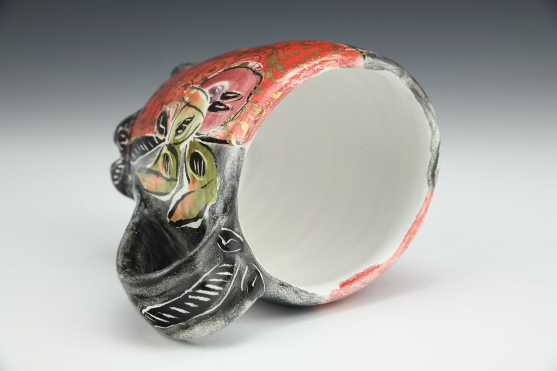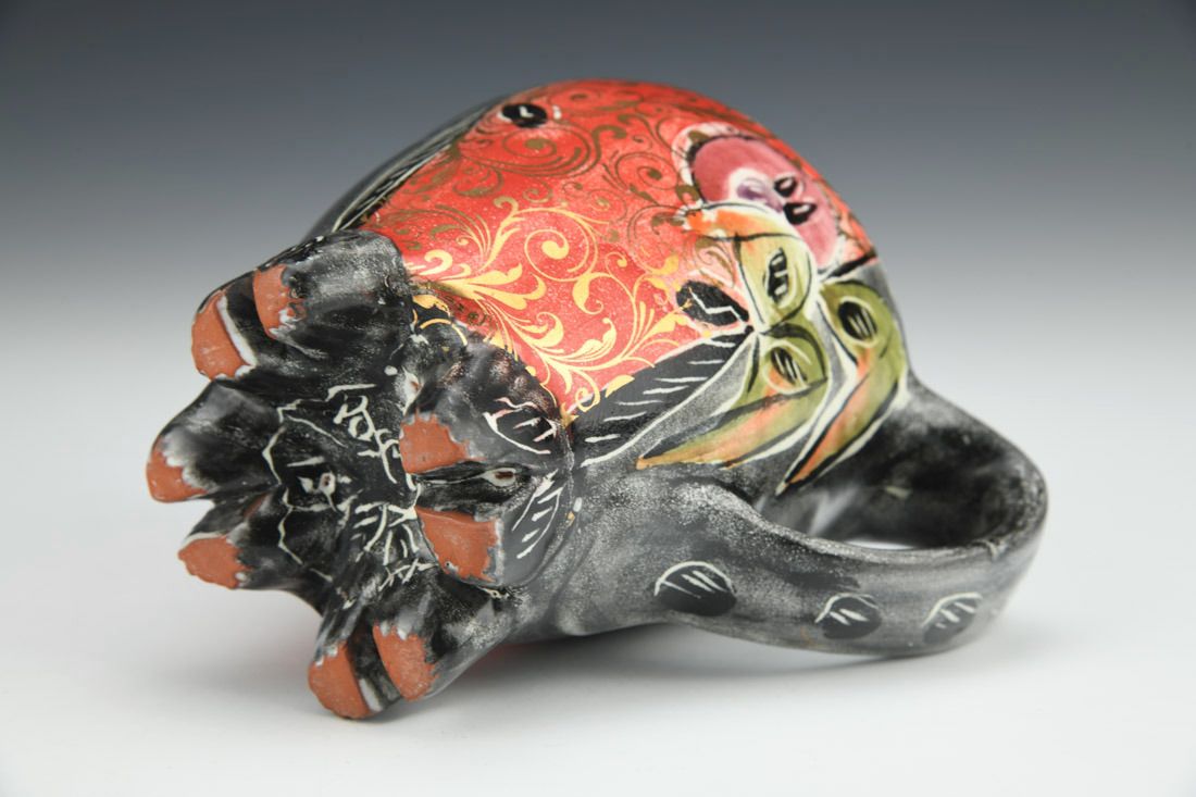Terra cotta, wheel thrown and altered, majolica, gold decal, cone 04 electric fired, 4.5 x 5.25 x 3.5 inches.
