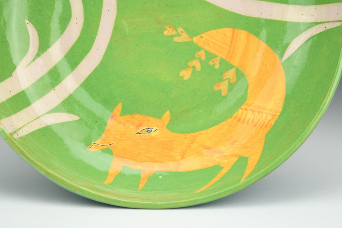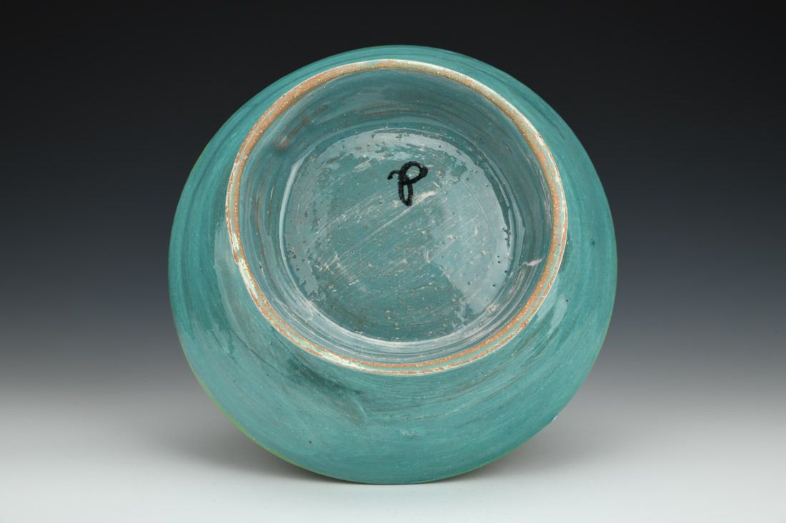 Earthenware, wheel thrown, paper stencils, slip, underglaze, glaze, cone 02 electric fired, 2.75 x 9 x 8.75 inches.