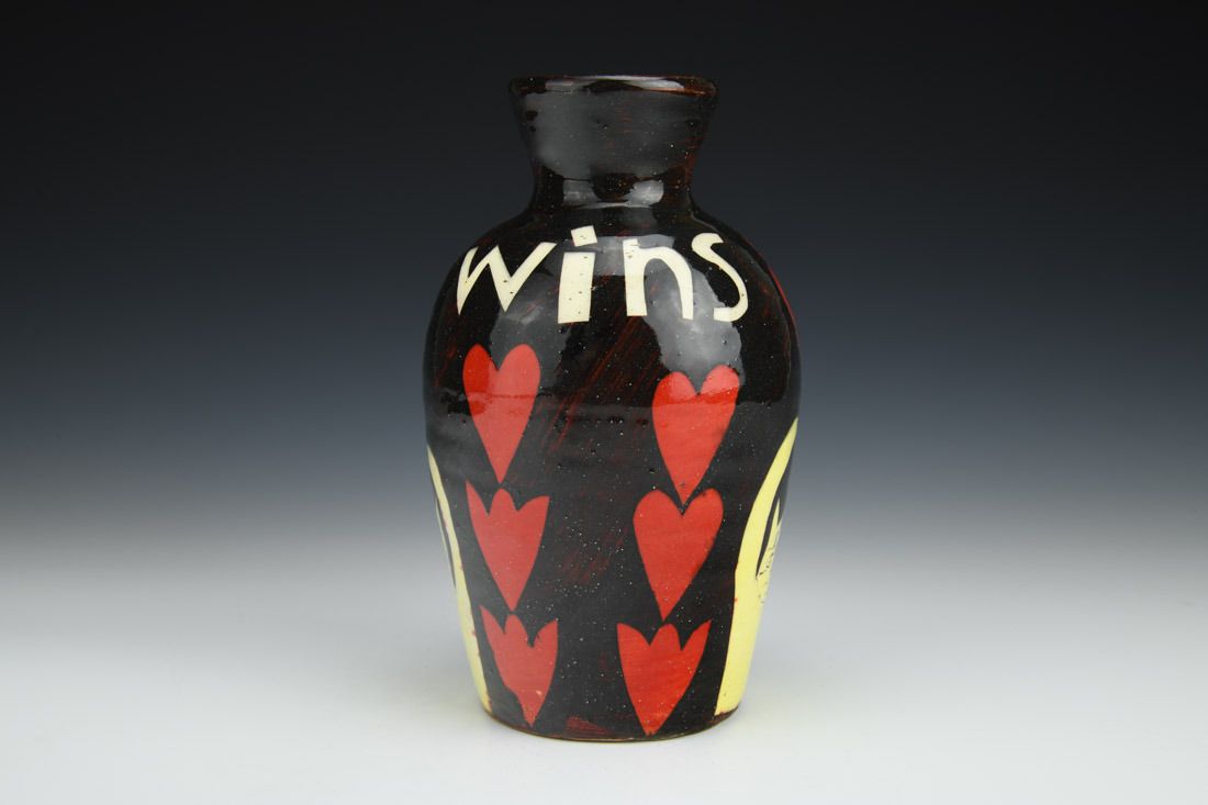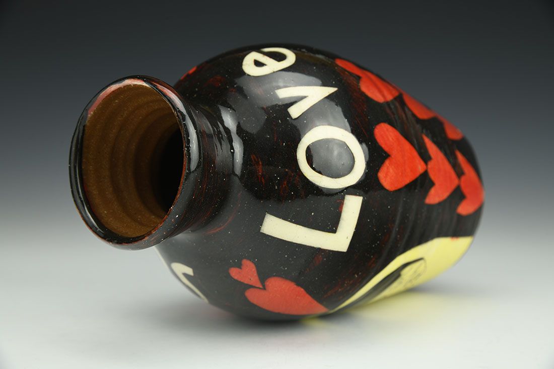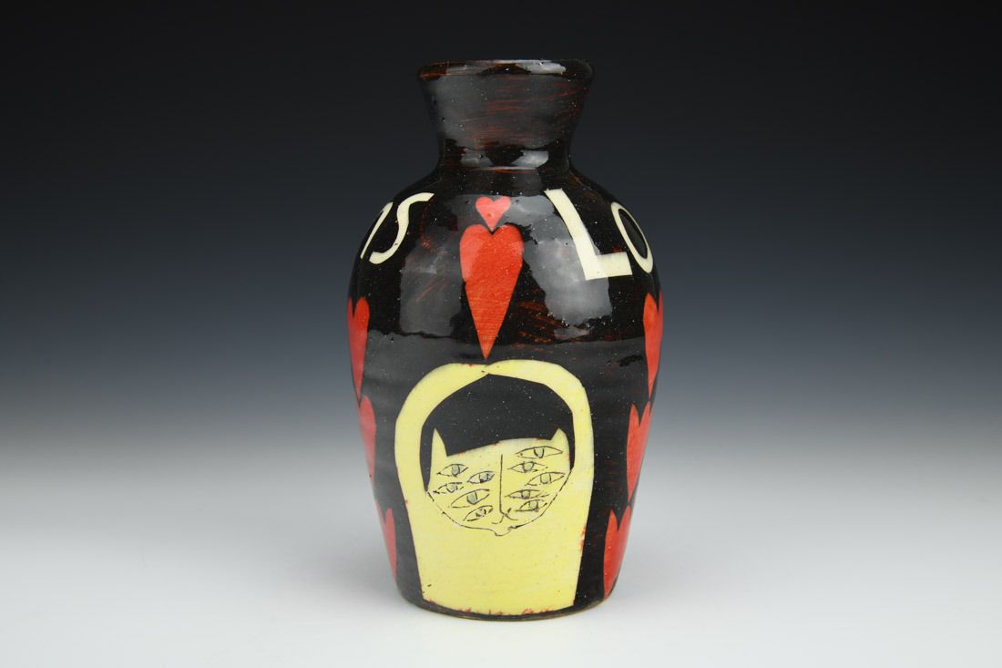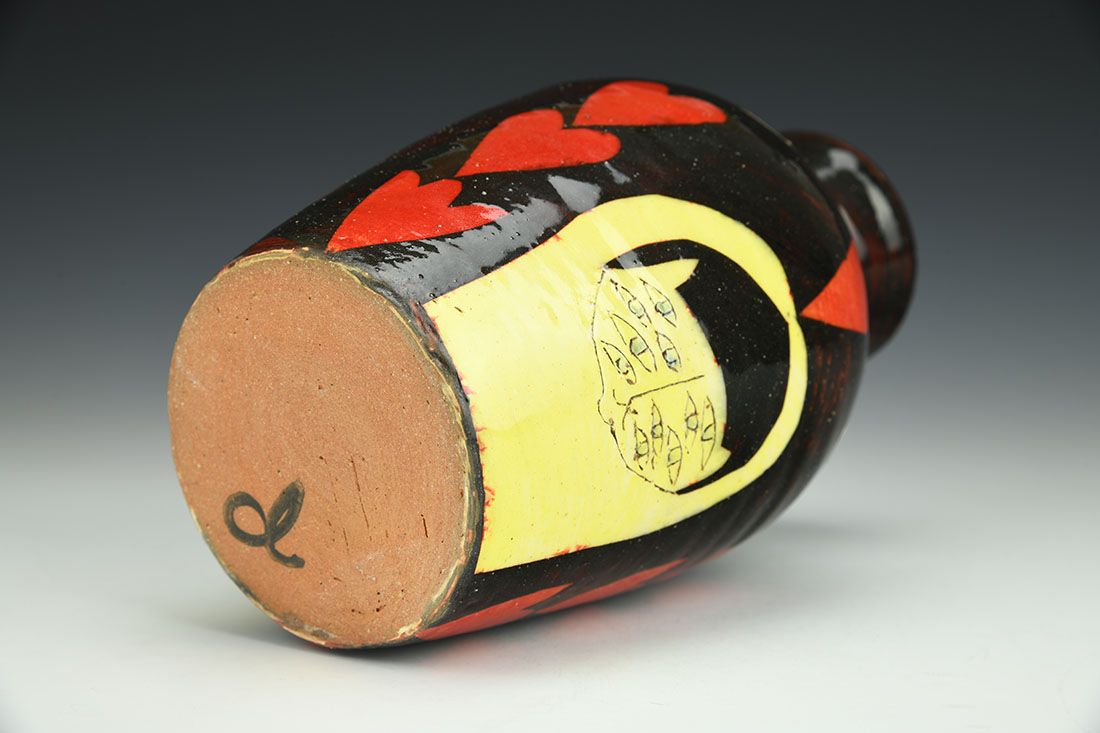 Earthenware, wheel thrown, paper stencils, slip, underglaze, glaze, cone 02 electric fired, 7.5 x 4.5 x 4.5 inches.