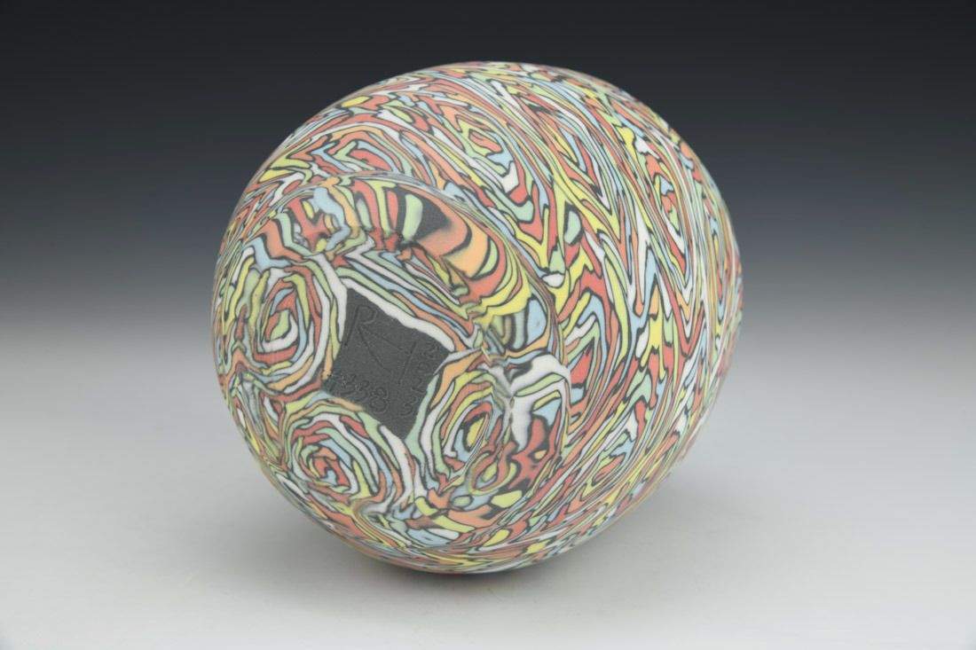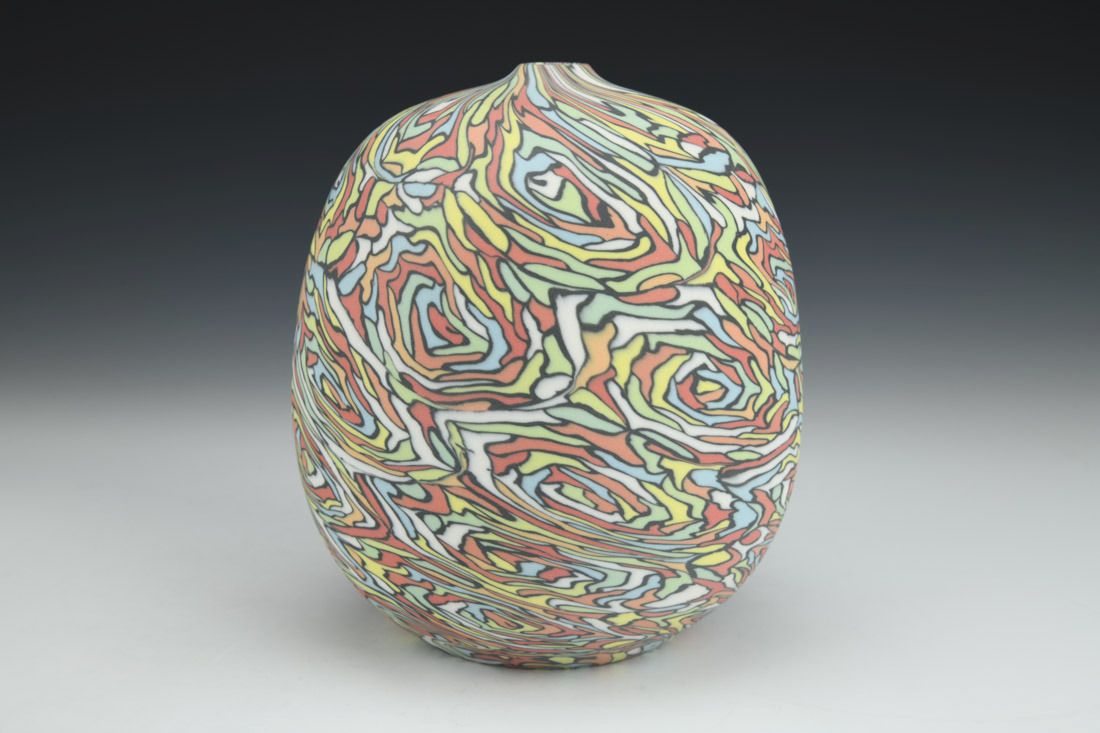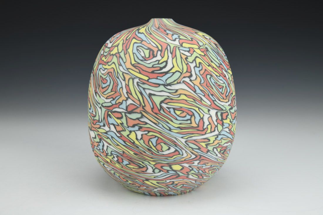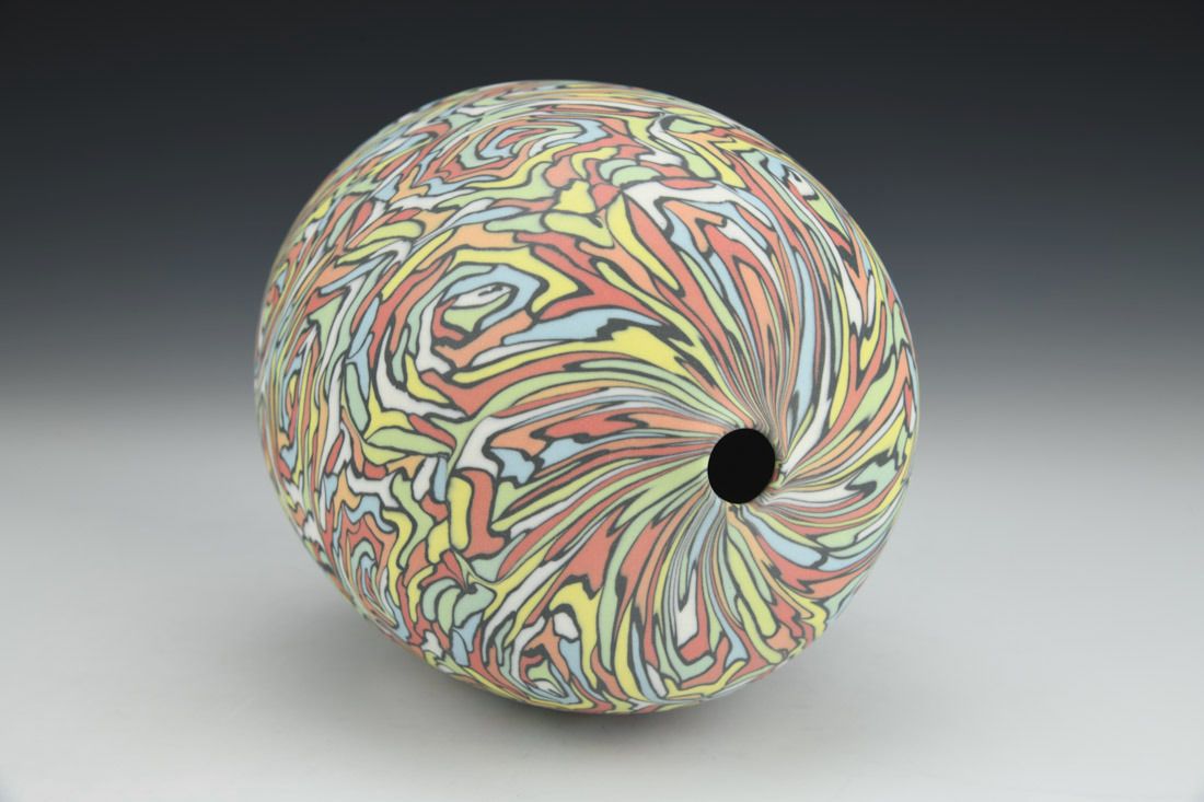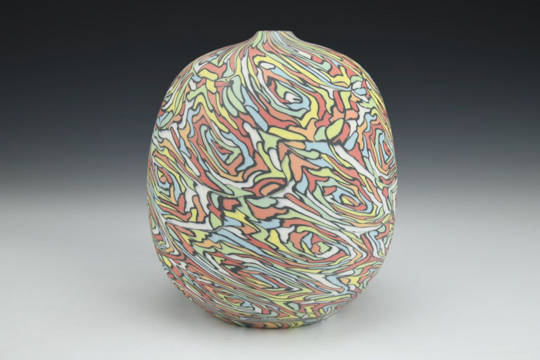 Colored porcelain, wheel thrown and hand built, cone 6 fired, 6.5 x 5 x 5 inches.