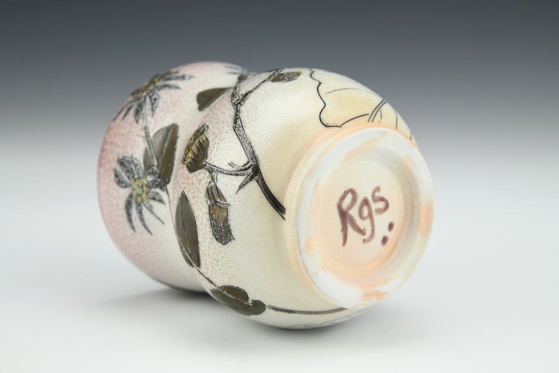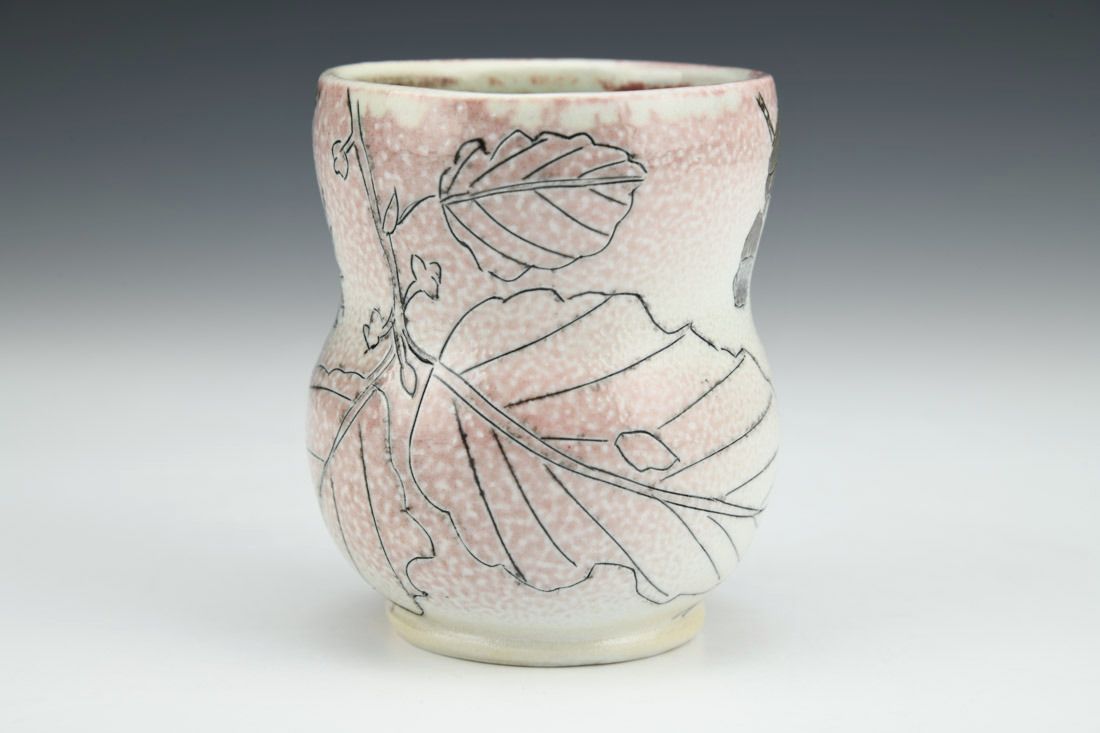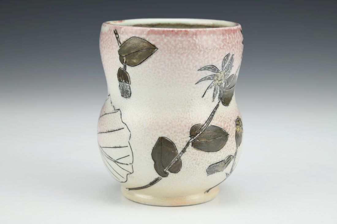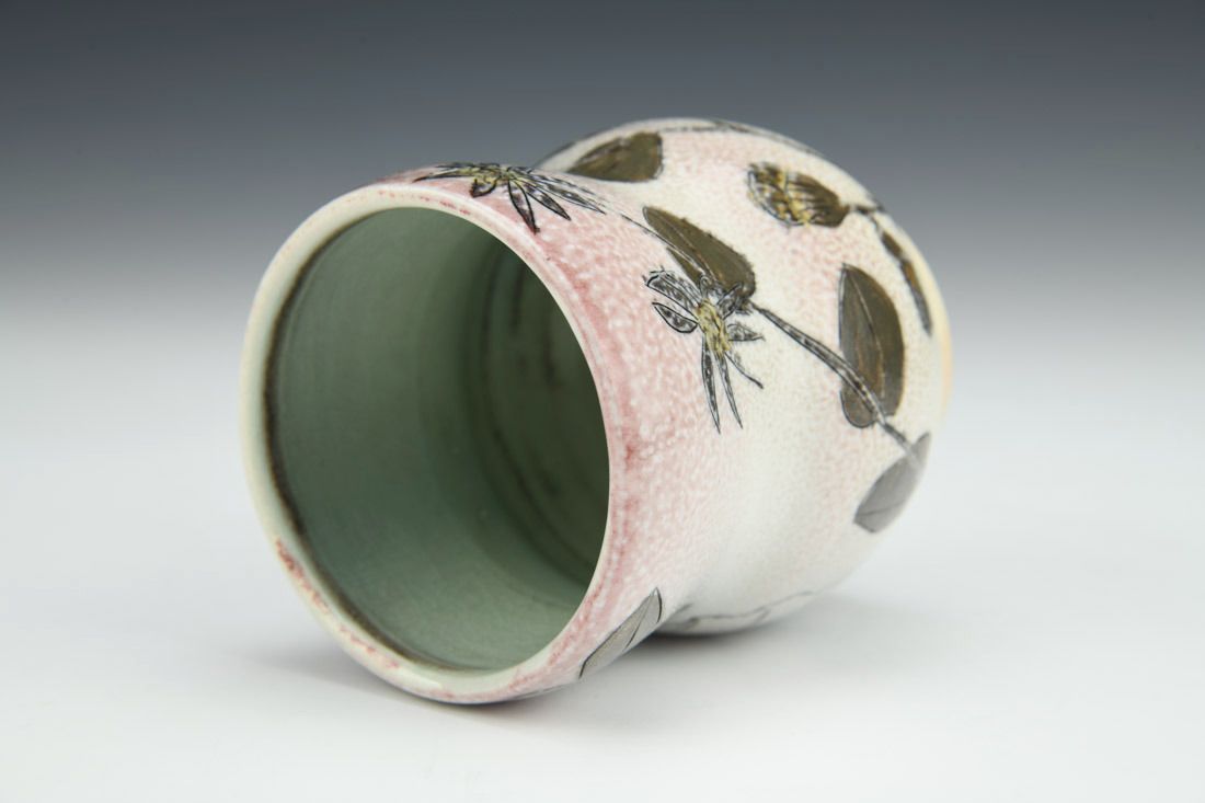 Porcelain, wheel thrown, inlaid, trailed and brushed decoration, underglaze, glaze, cone 7 soda/salt fired, 3.5 x 2.75 x 2.75 inches.