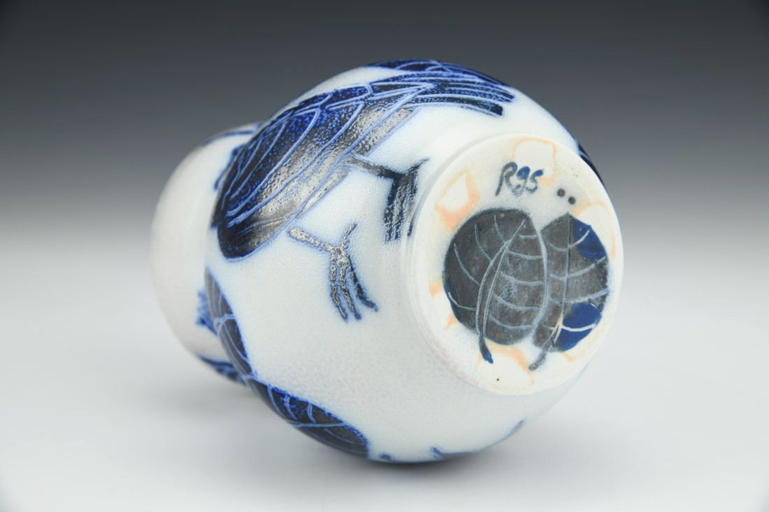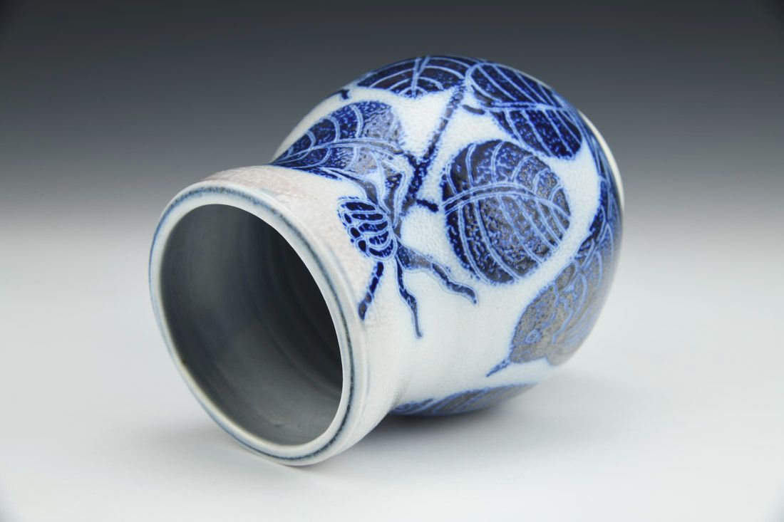 Porcelain, wheel thrown, inlaid, trailed and brushed decoration, underglaze, glaze, cone 7 soda/salt fired, 5.25 x 3.75 x 3.75 inches.