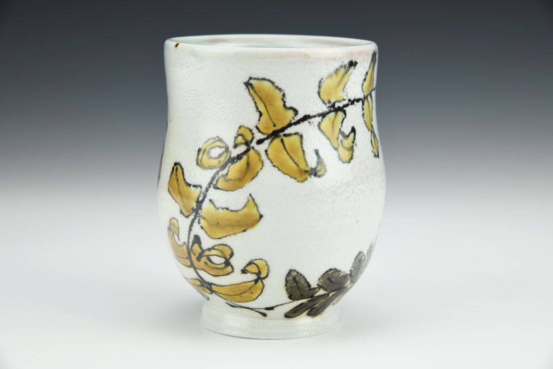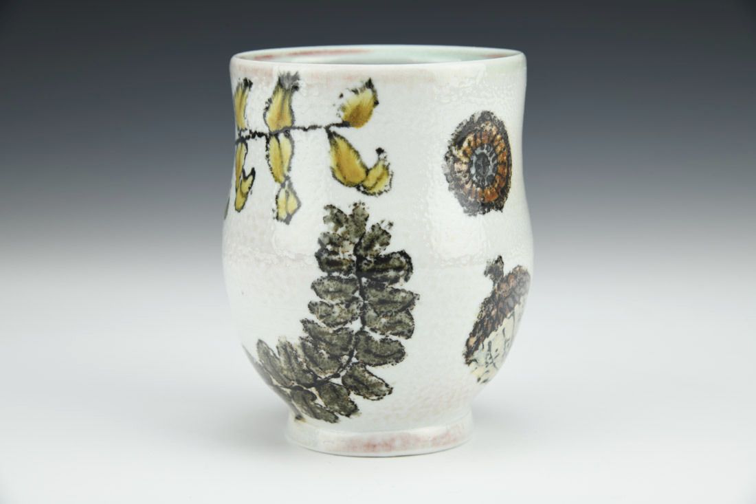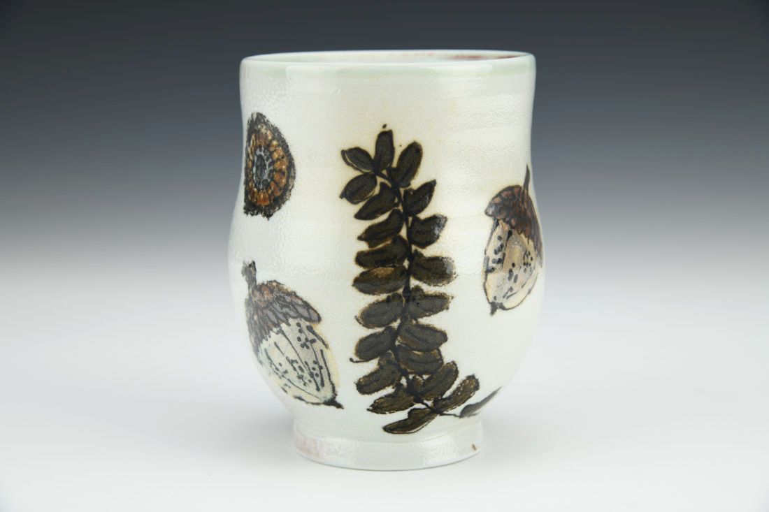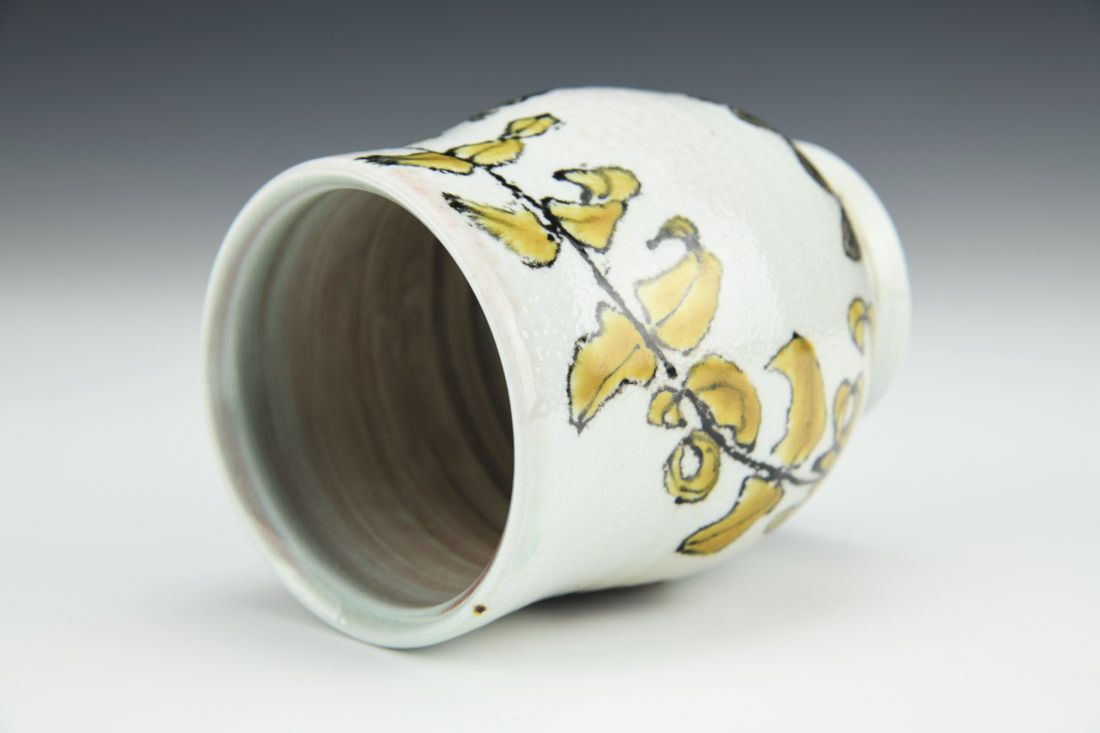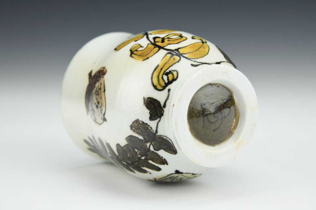 Porcelain, wheel thrown, trailed, brushed, slip, underglaze, glaze, cone 7 soda fired, 3.75 x 2.75 x 2.75 inches.