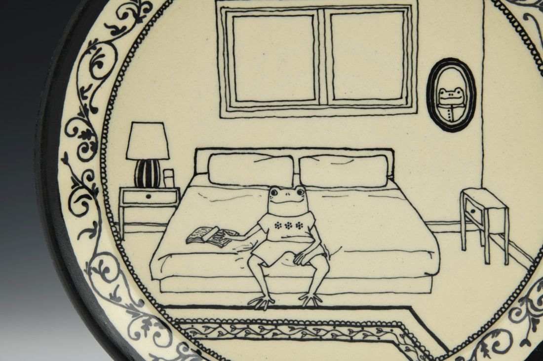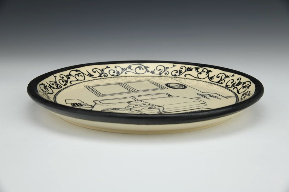 White stoneware, wheel thrown, slip trailed, black slip, cone 6 oxidation fired, 1 x 8.5 x 8.5 inches.