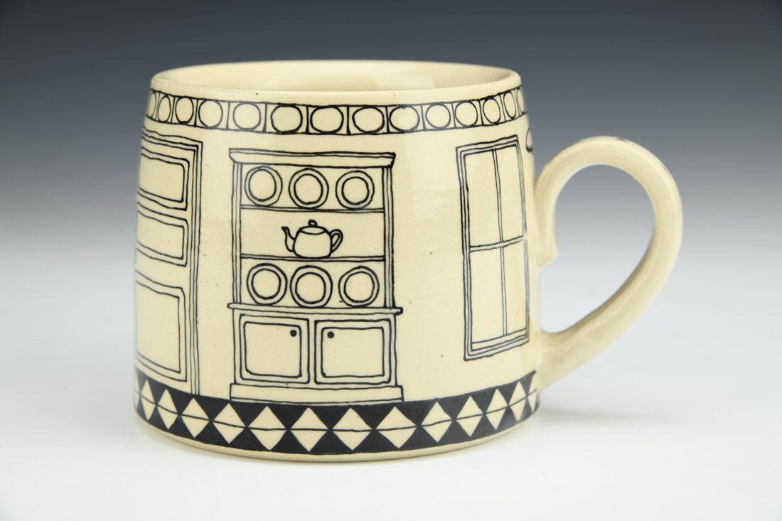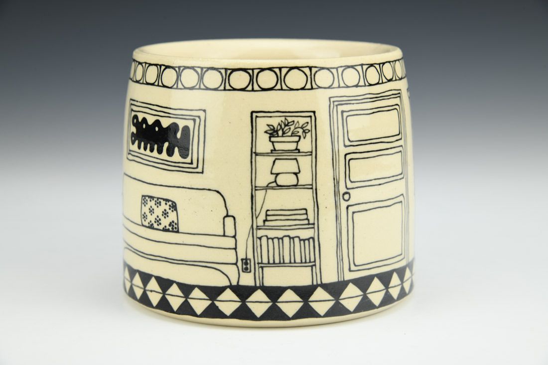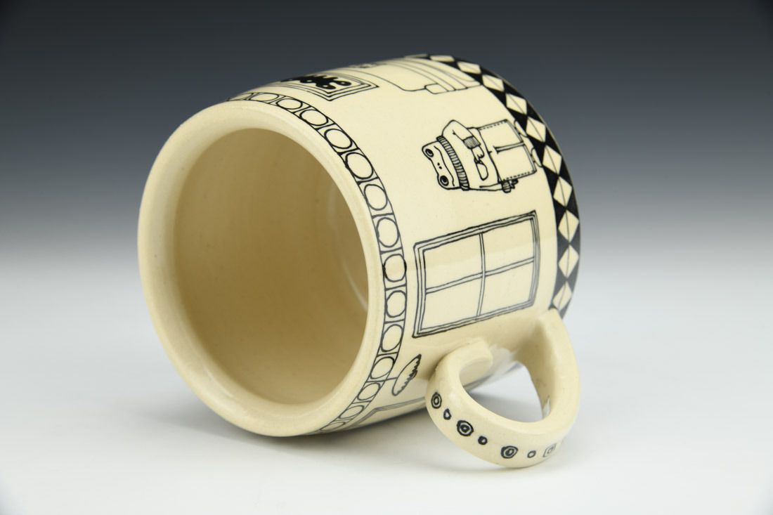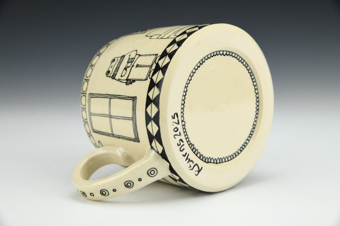 White stoneware, wheel thrown, slip trailed black underglaze, cone 6 oxidation fired, 3.25 x 5.25 x 4 inches.