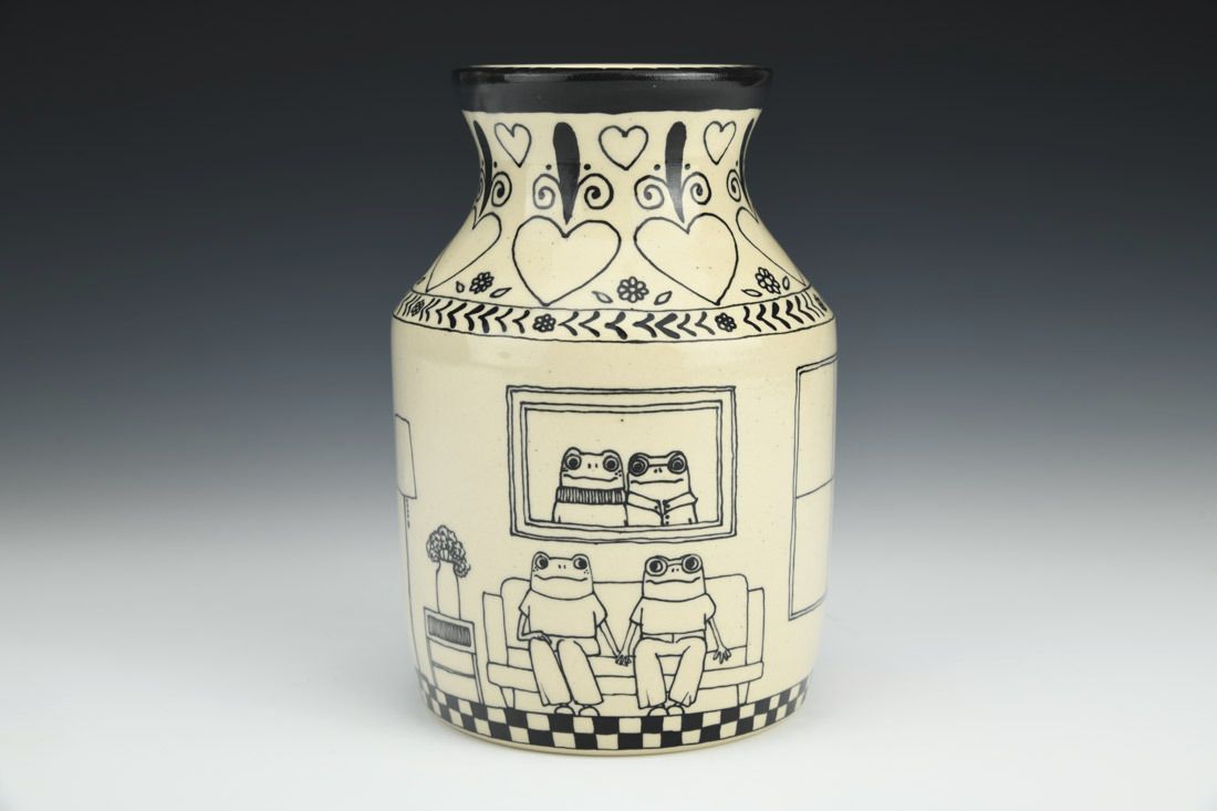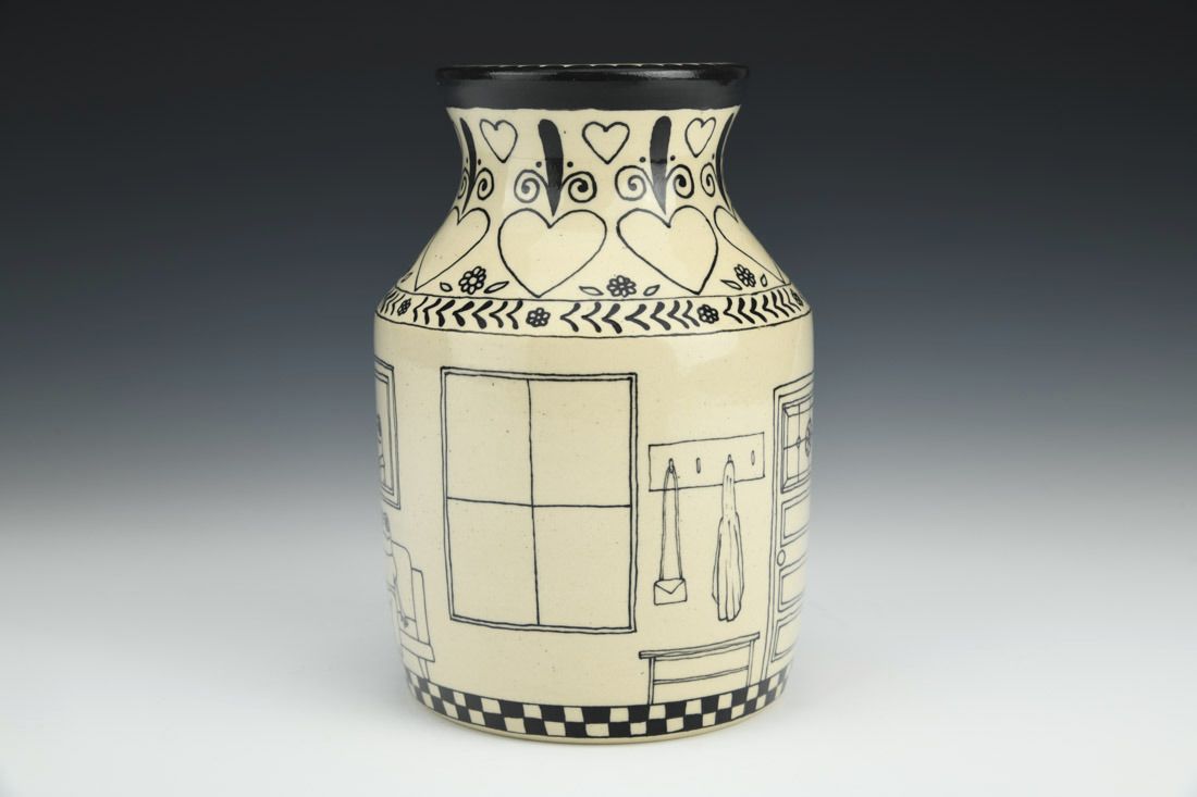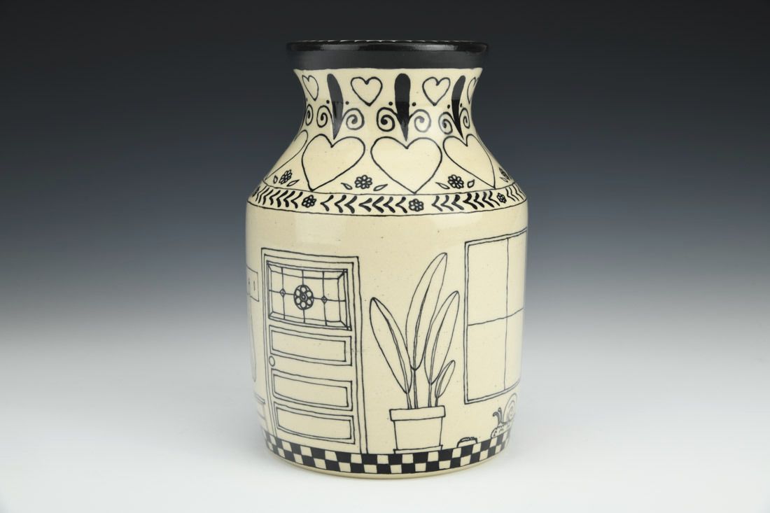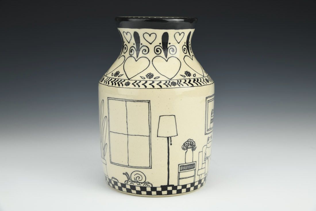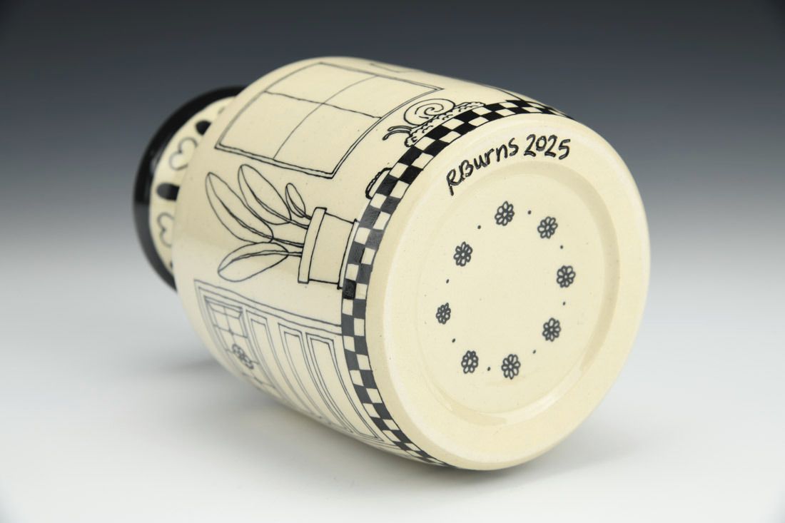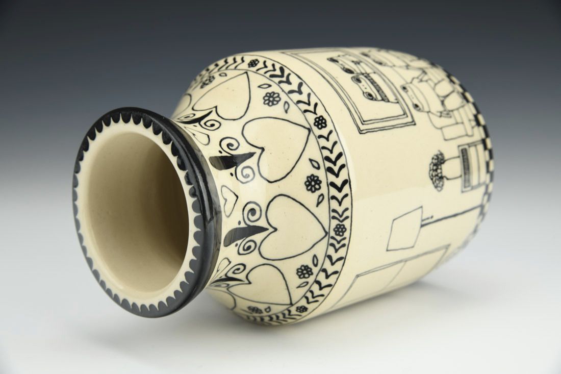 White stoneware, wheel thrown, slip trailed black underglaze, cone 6 oxidation fired, 6.5 x 4 x 4 inches.