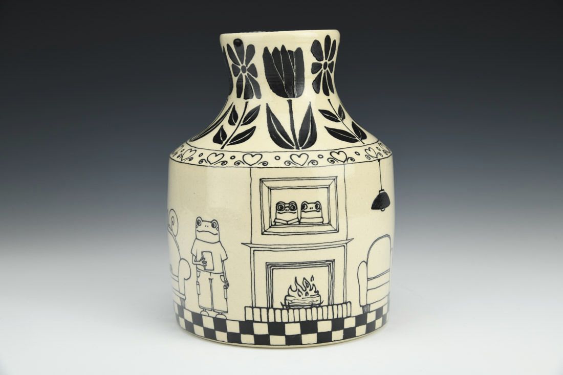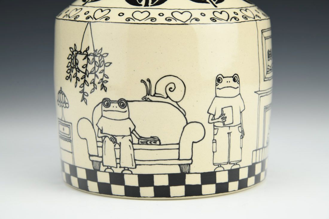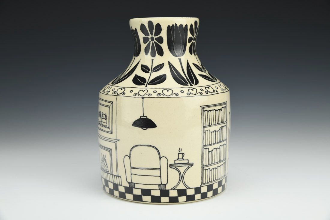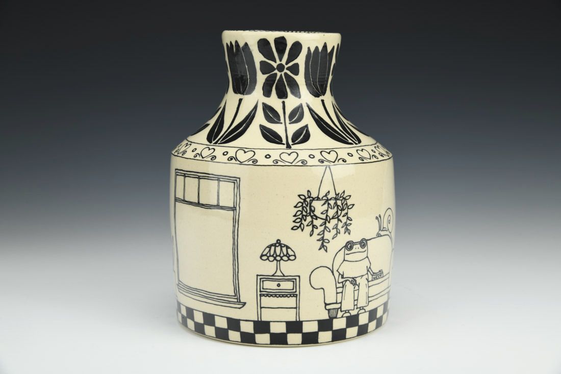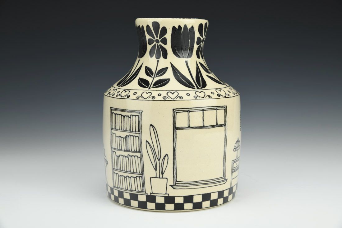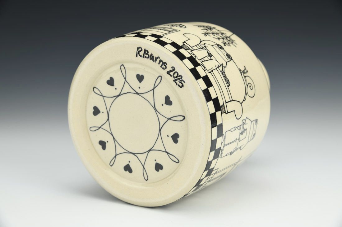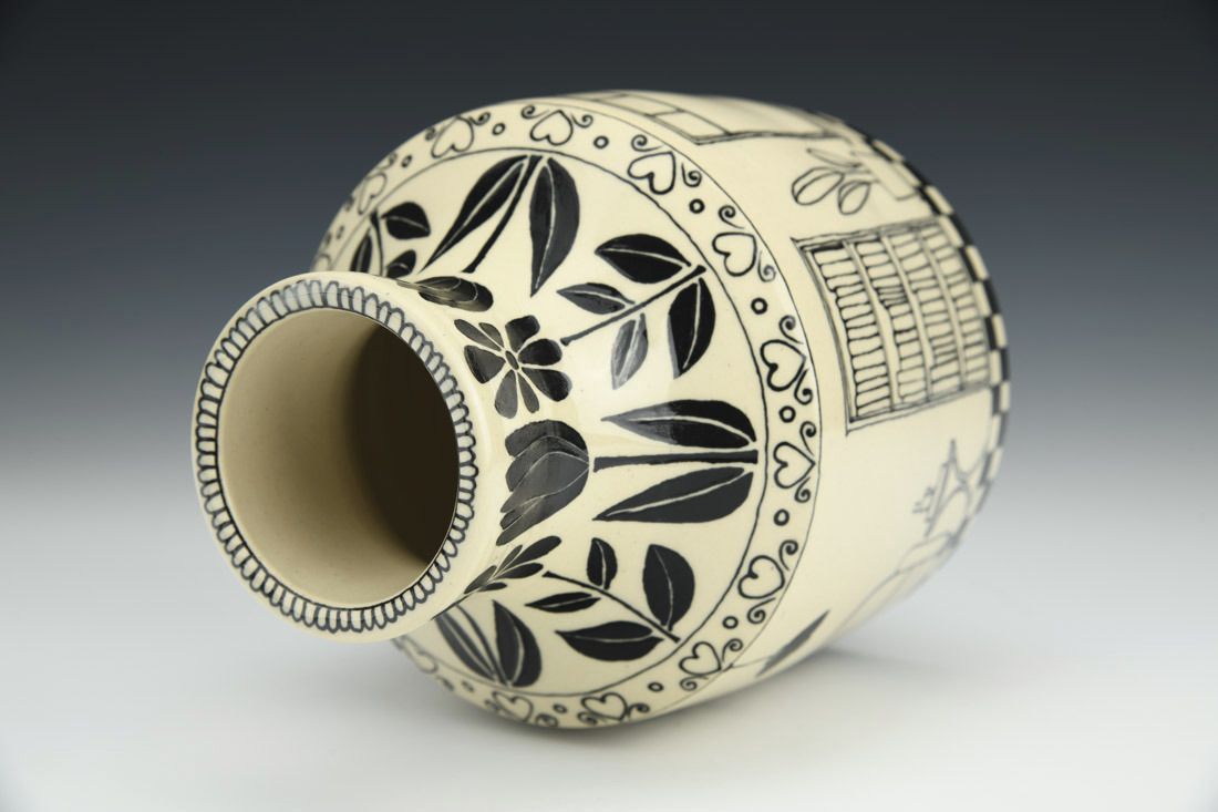 White stoneware, wheel thrown, slip trailed black underglaze, cone 6 oxidation fired, 6.5 x 4.75 x 4.75 inches.