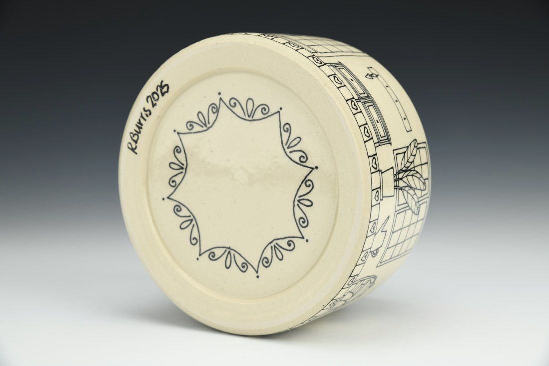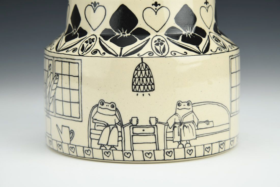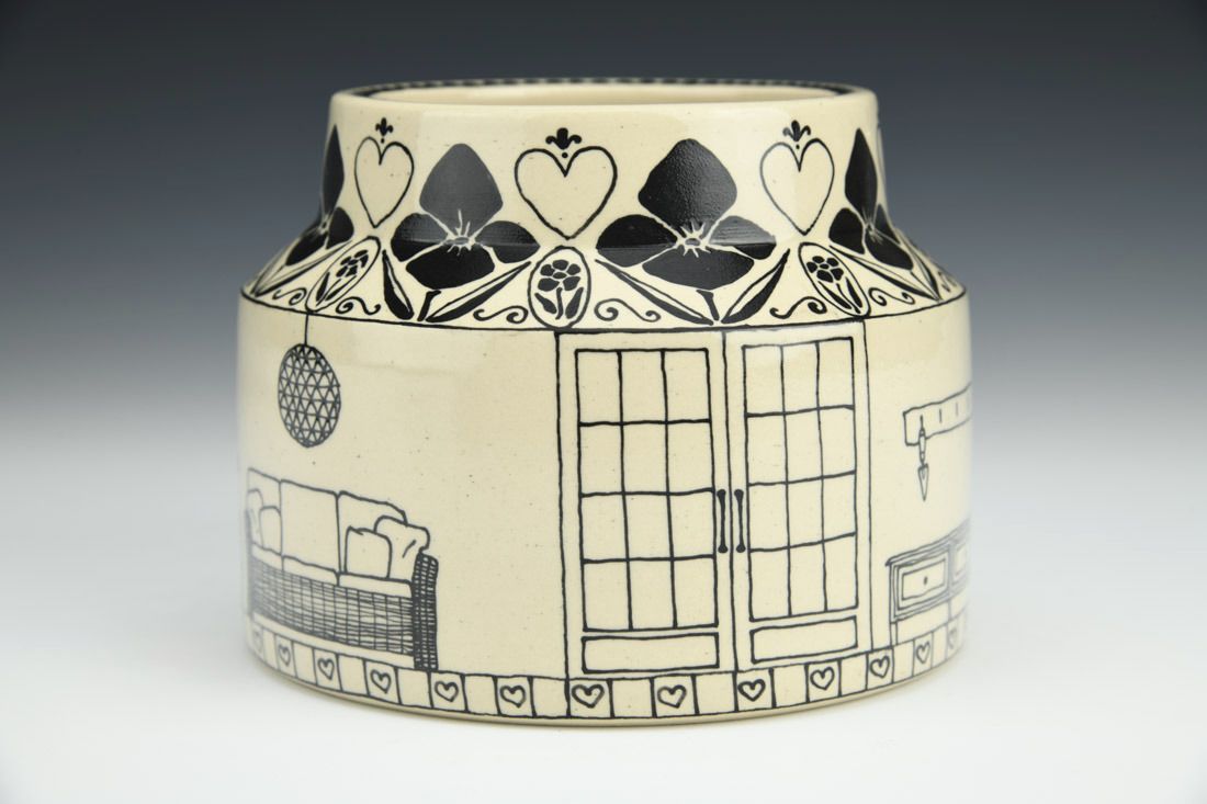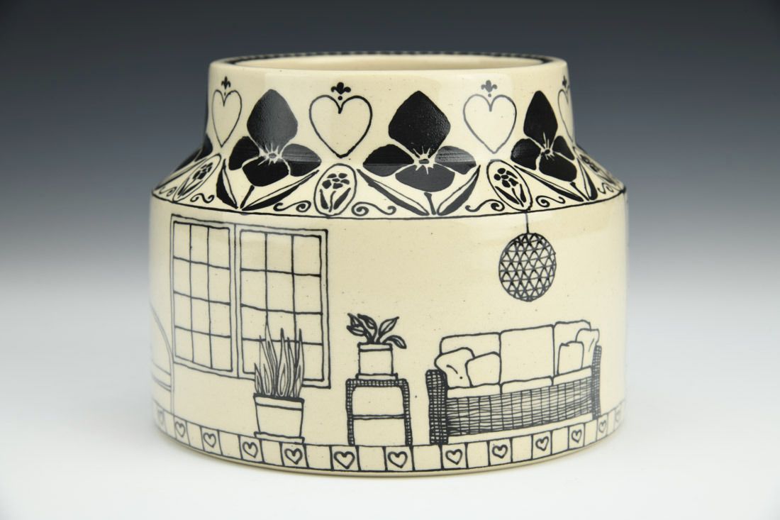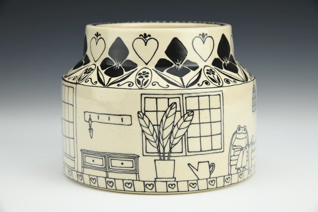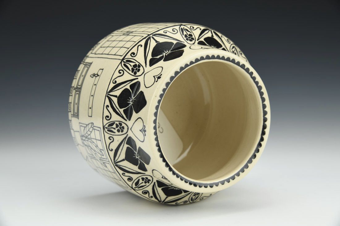White stoneware, wheel thrown, slip trailed black underglaze, cone 6 oxidation fired, 4 x 5 x 5 inches.