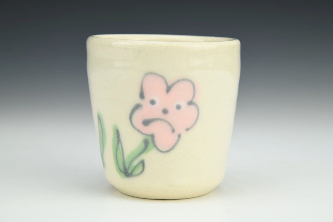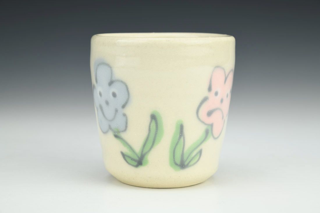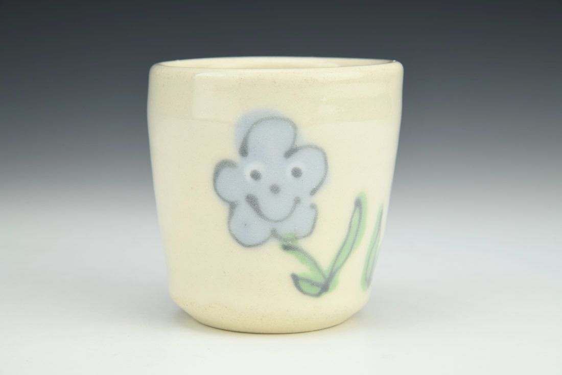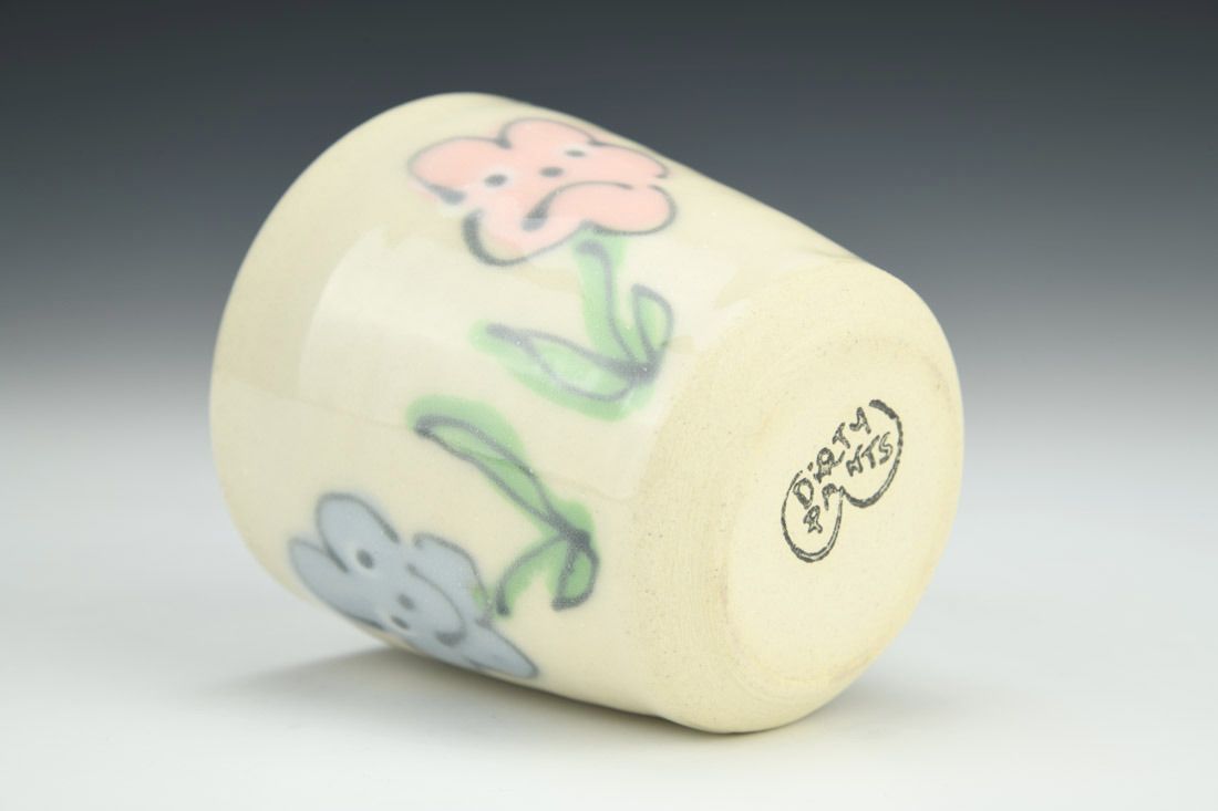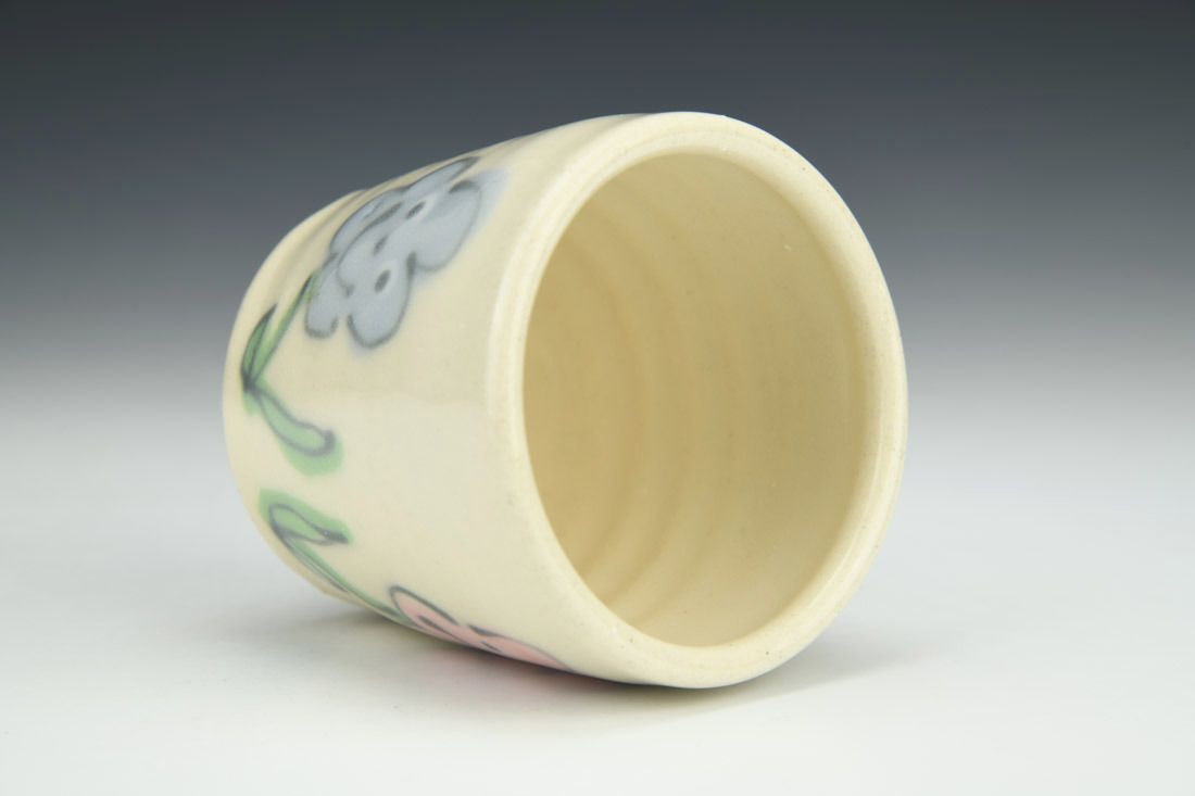 Stoneware, wheel thrown, underglaze, glaze, cone 5 electric fired, 3 x 3 x 3 inches.