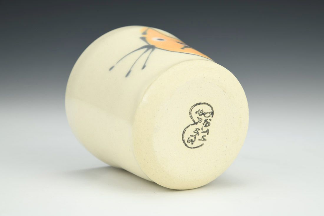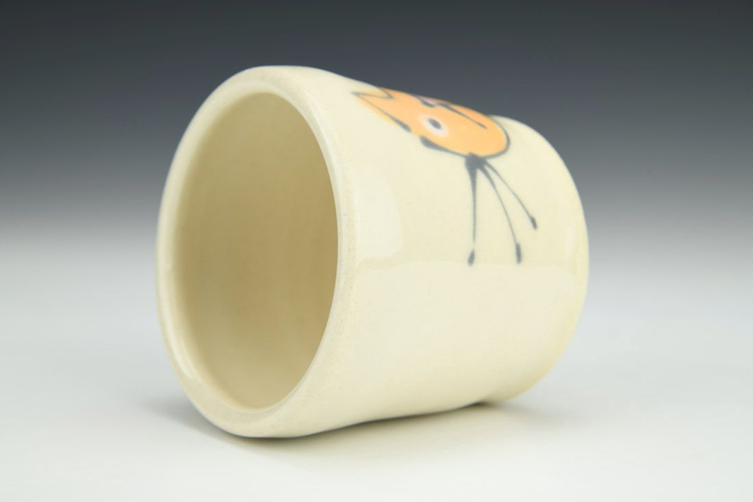 Stoneware, wheel thrown, underglaze, glaze, cone 5 electric fired, 3 x 3 x 3 inches.