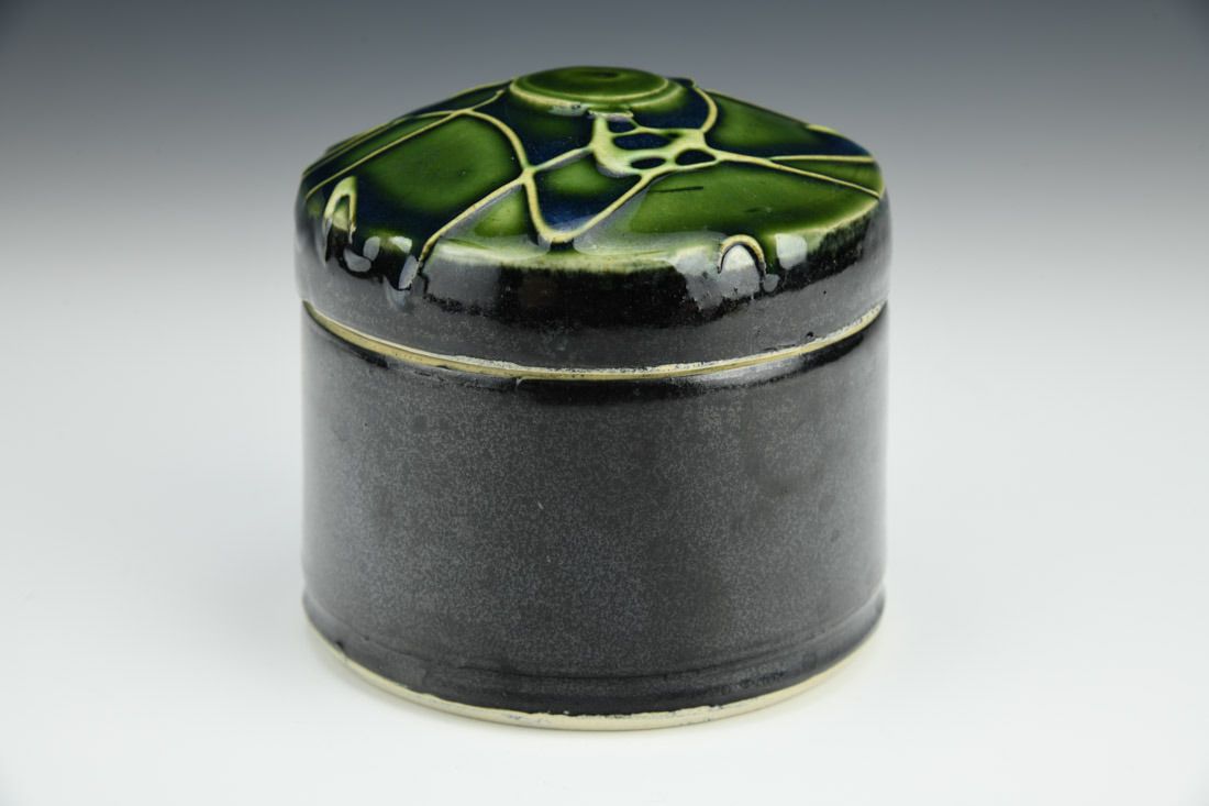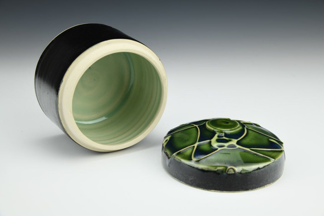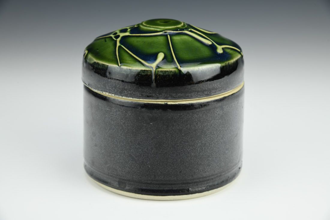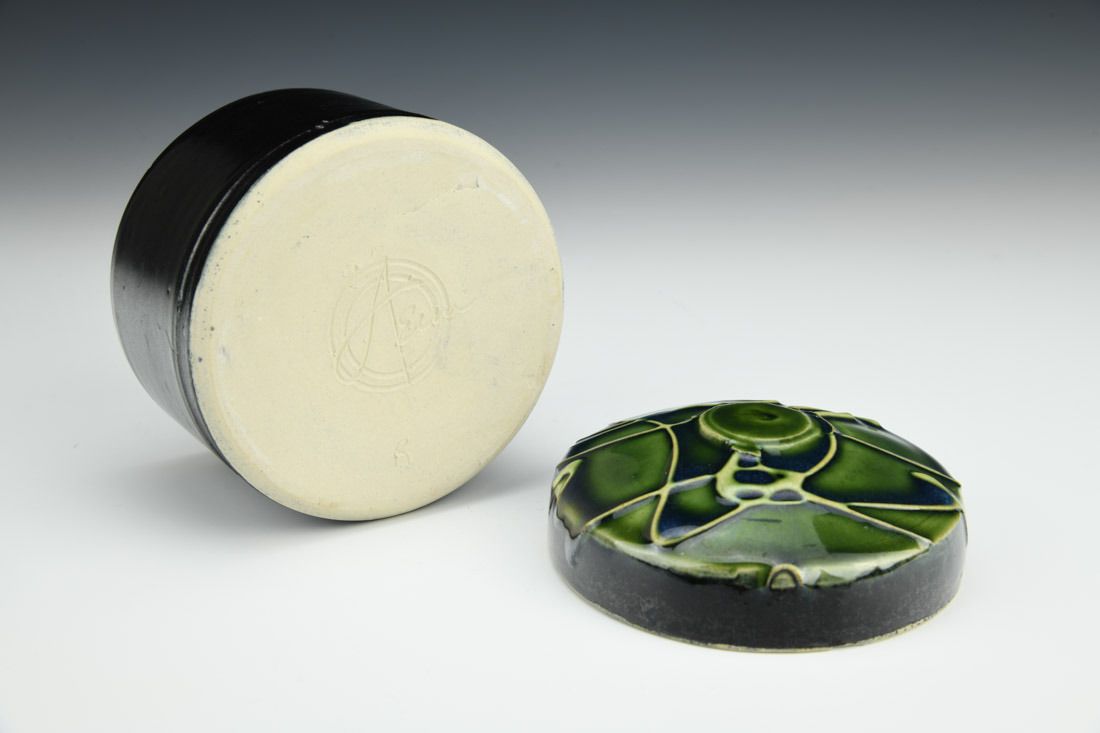 Stoneware, wheel thrown, slip trailed, cone 5 oxidation fired, 4.25 x 4 x 4 inches.