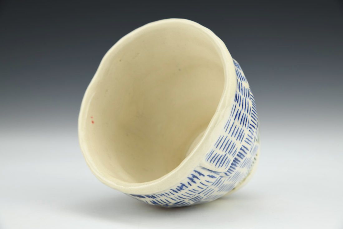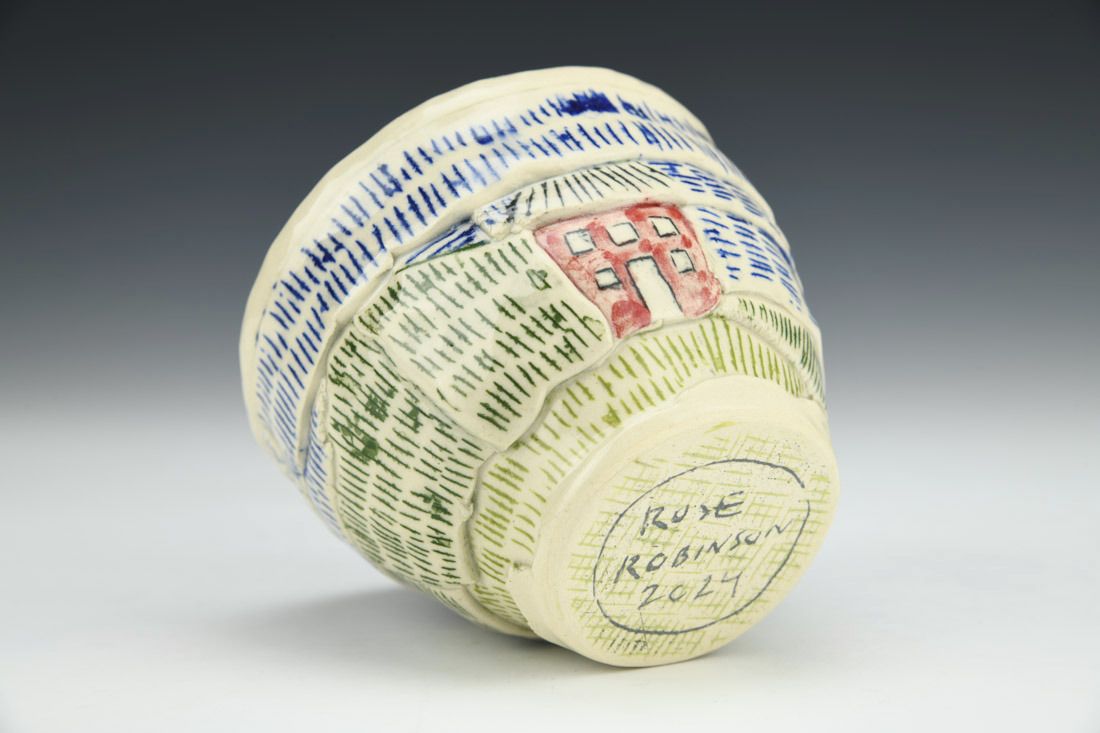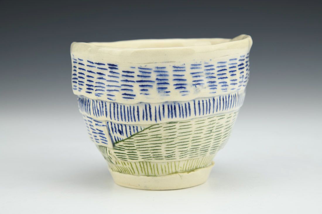 Stoneware, hand built, inlaid underglaze, glaze, cone 6 electric fired, 3 x 4 x 4 inches.