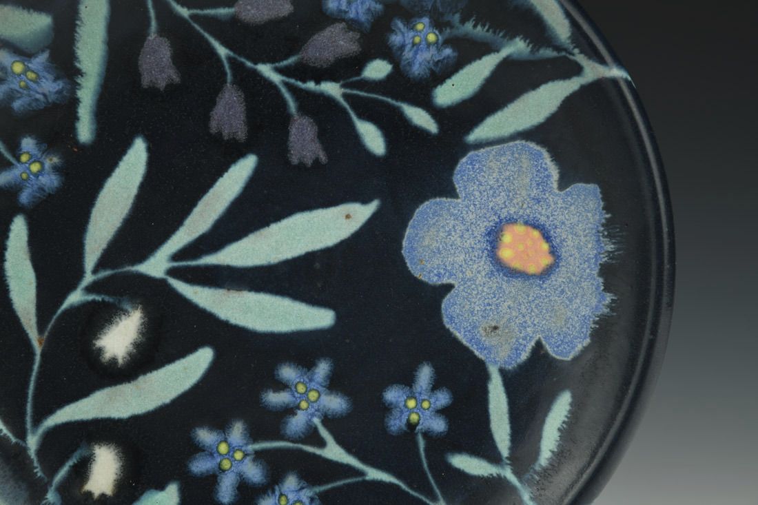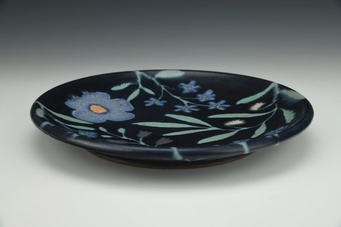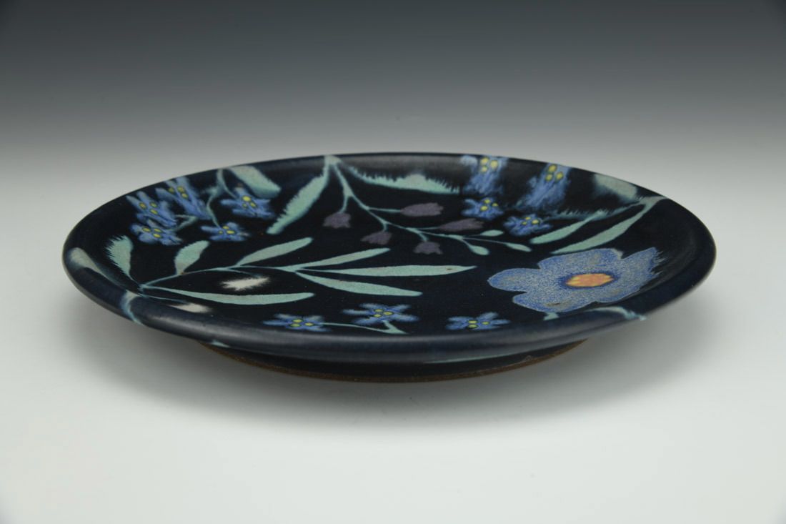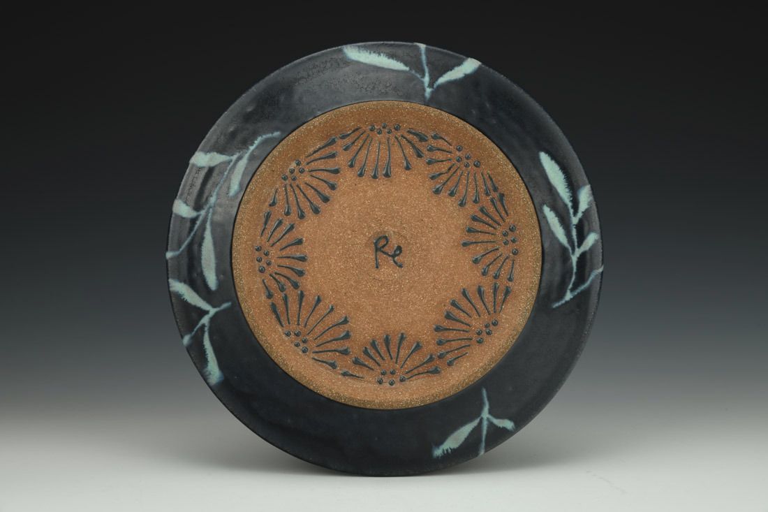 Mid-range red stoneware, wheel thrown, multiple glazes, cone 6 oxidation fired, 1.25 x 9 x 9 inches.