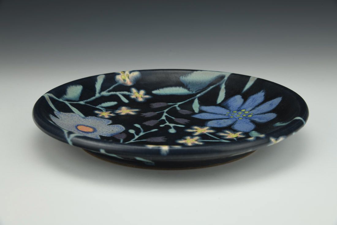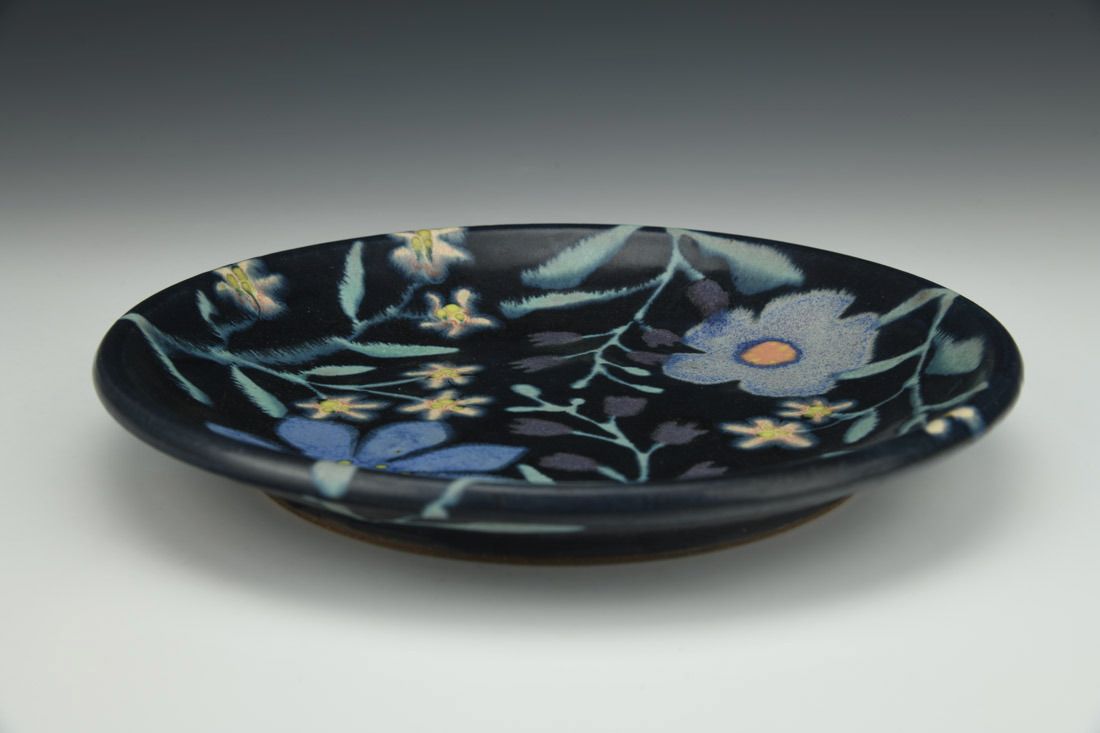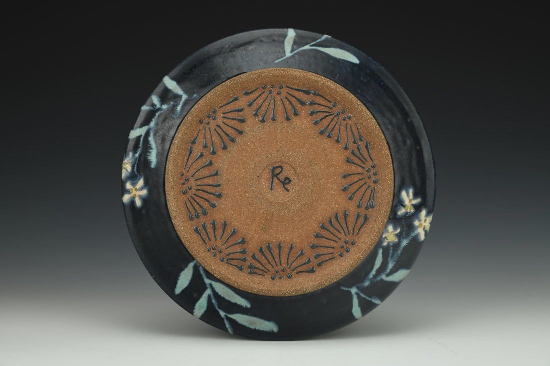 Mid-range red stoneware, wheel thrown, multiple glazes, cone 6 oxidation fired, 1.25 x 9 x 9 inches.