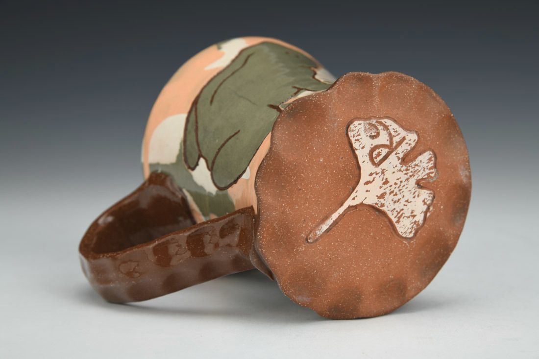 Earthen Red clay with colored engobes, wheel thrown, Darbey White liner glaze, clear glaze, cone 1 oxidation fired, 3.5 x 4.75 x 3.5 inches.