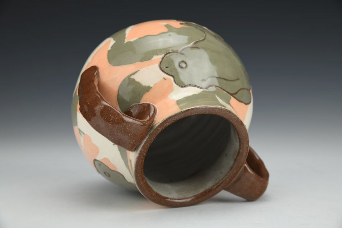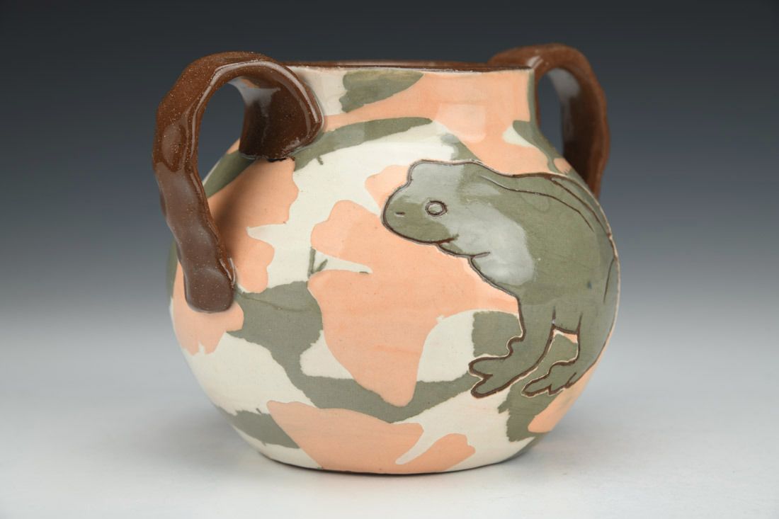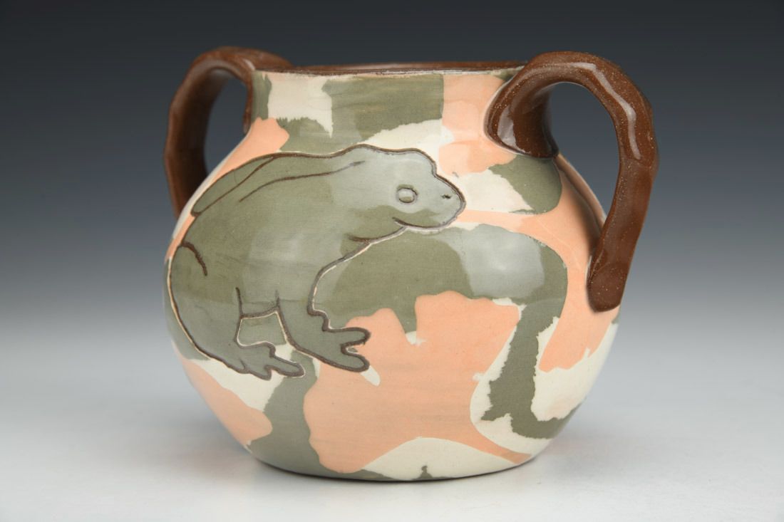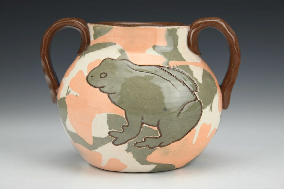 Earthen Red clay with colored engobes, wheel thrown, Darbey White liner glaze, clear glaze, cone 1 oxidation fired, 4 x 5.5 x 4.5 inches.