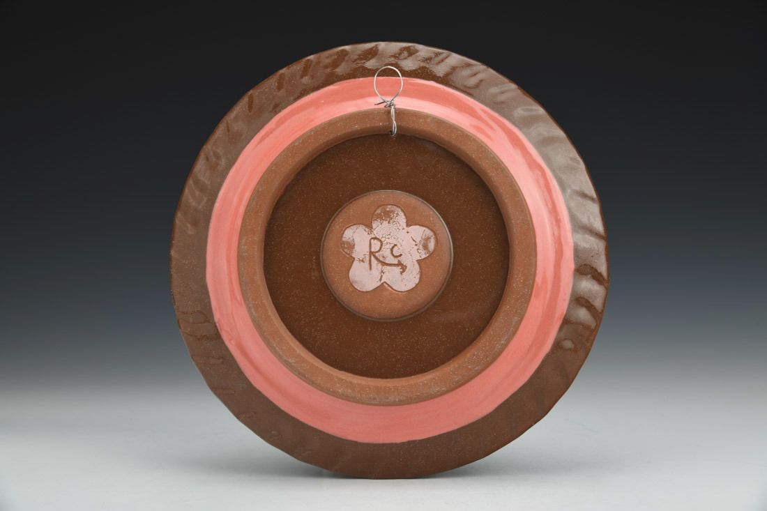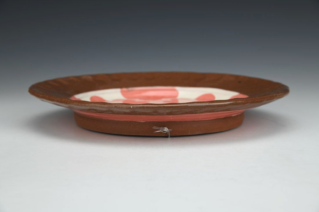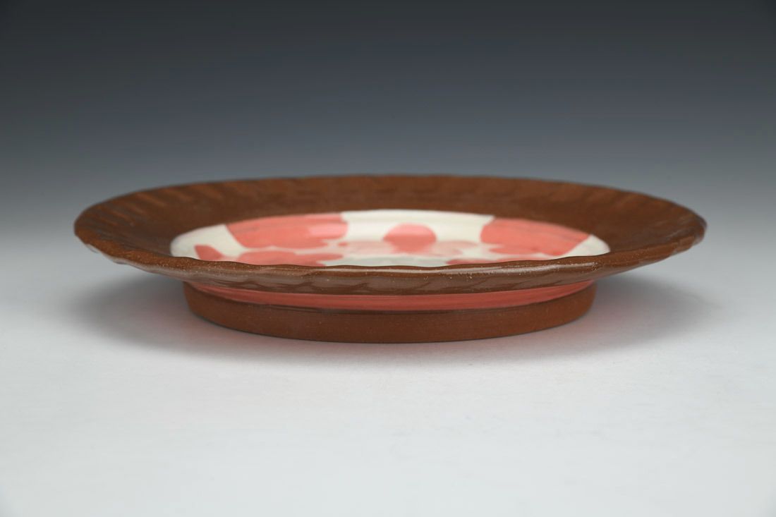 Earthen Red clay with colored engobes, wheel thrown, clear glaze, cone 1 oxidation fired, 1.25 x 8 x 8 inches.