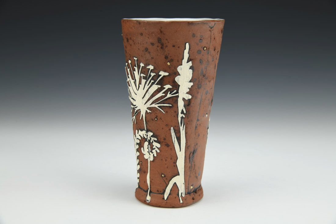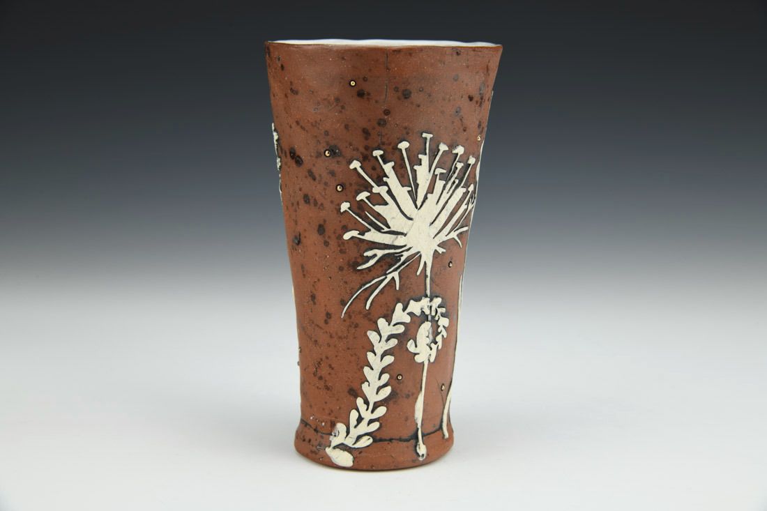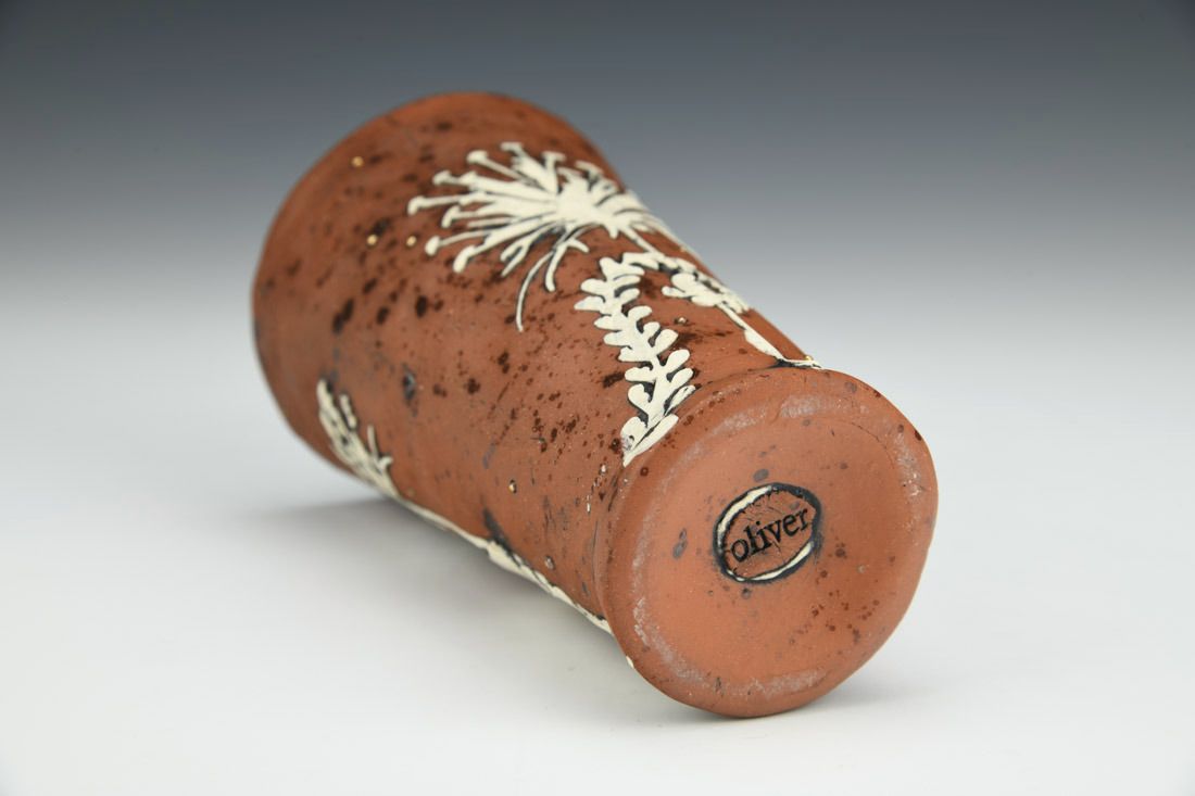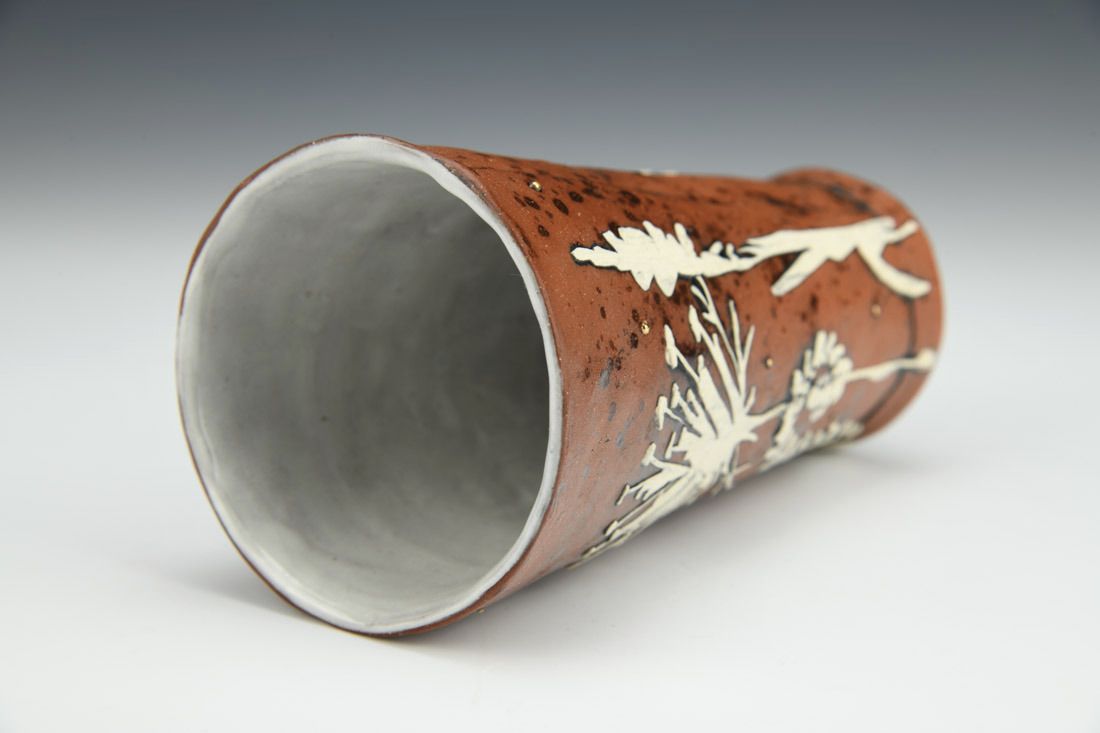 Earthenware, hand built with slabs, slip, underglaze, glaze, borax, luster, cone 1 electric fired, 5.5 x 3 x 3 inches.