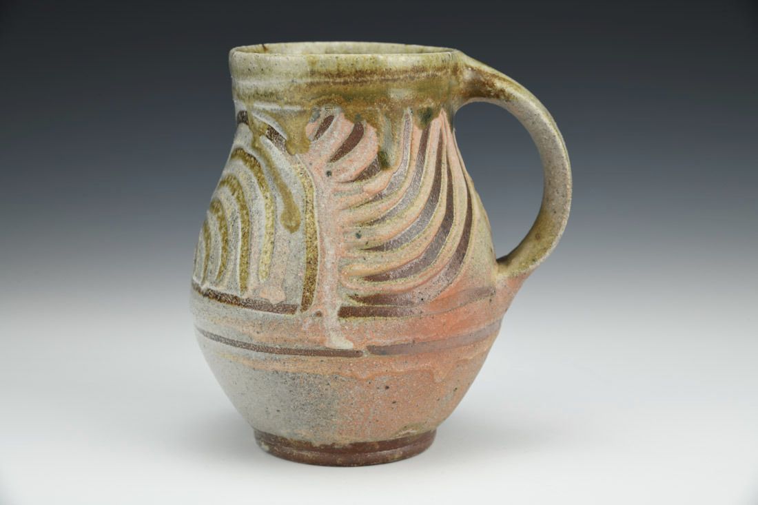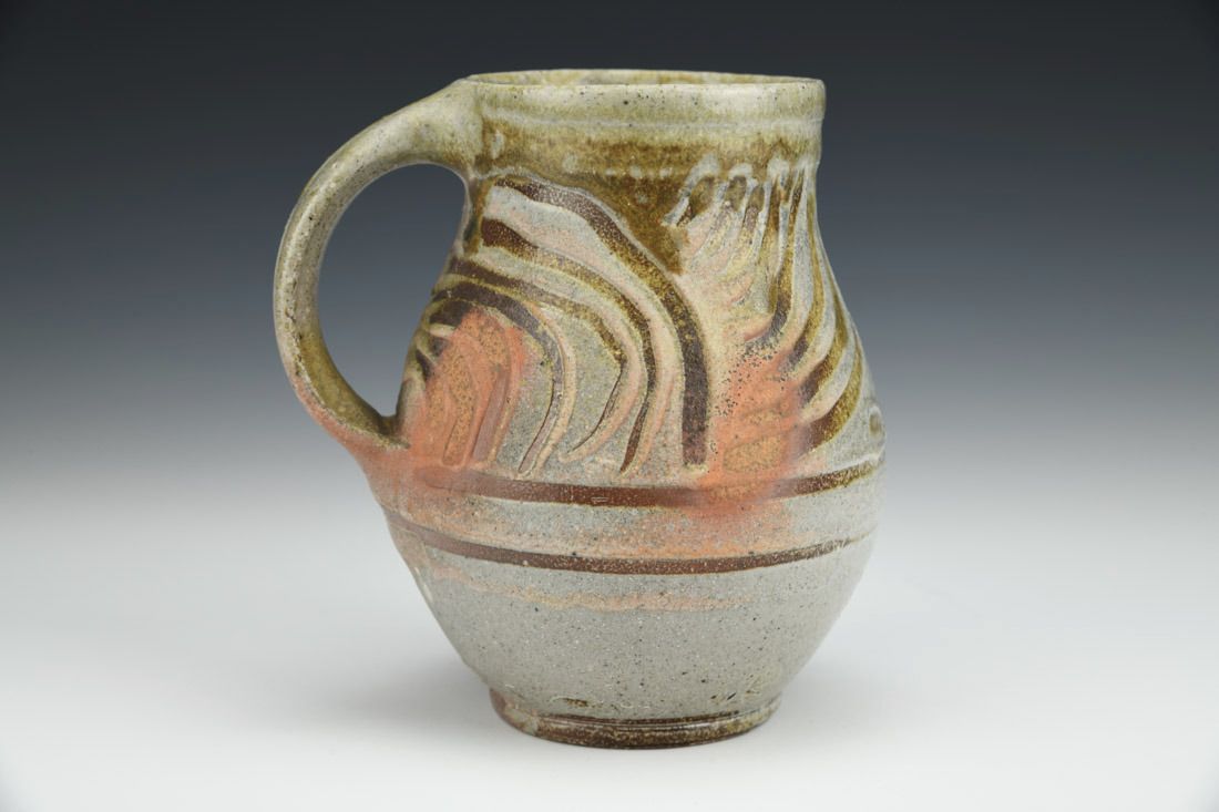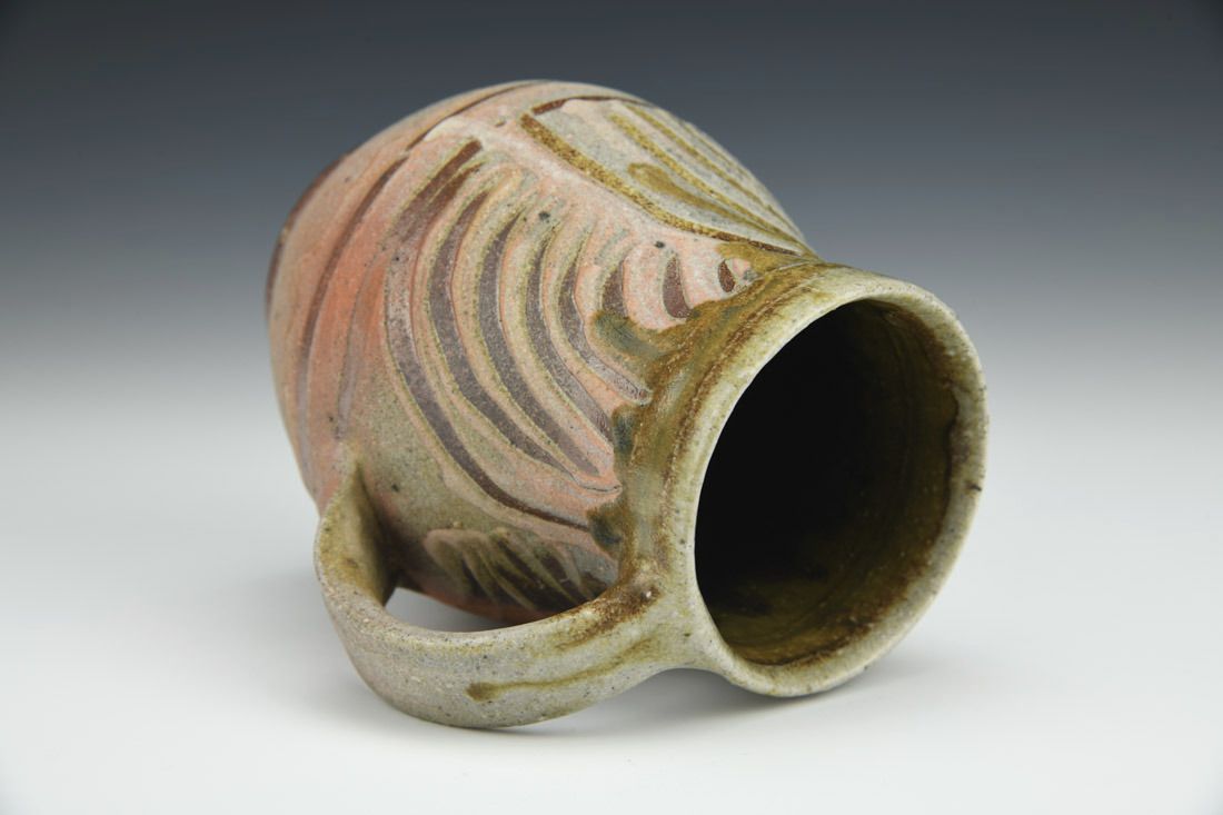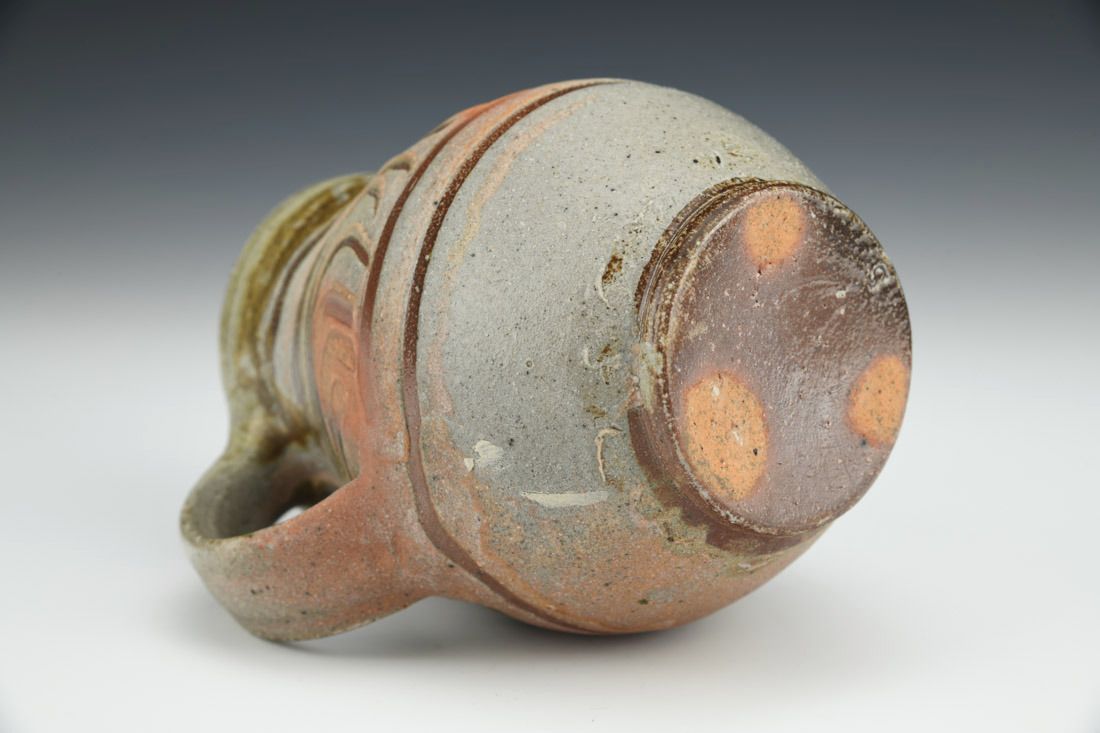 North Carolina clay blend, wheel thrown, local clay slip, ash glaze, woodfired for 120 hours with soda, 5 x 4.5 x 4 inches.