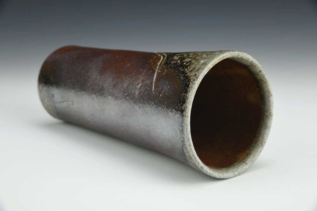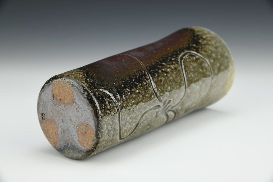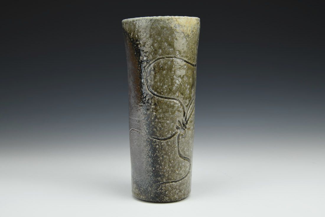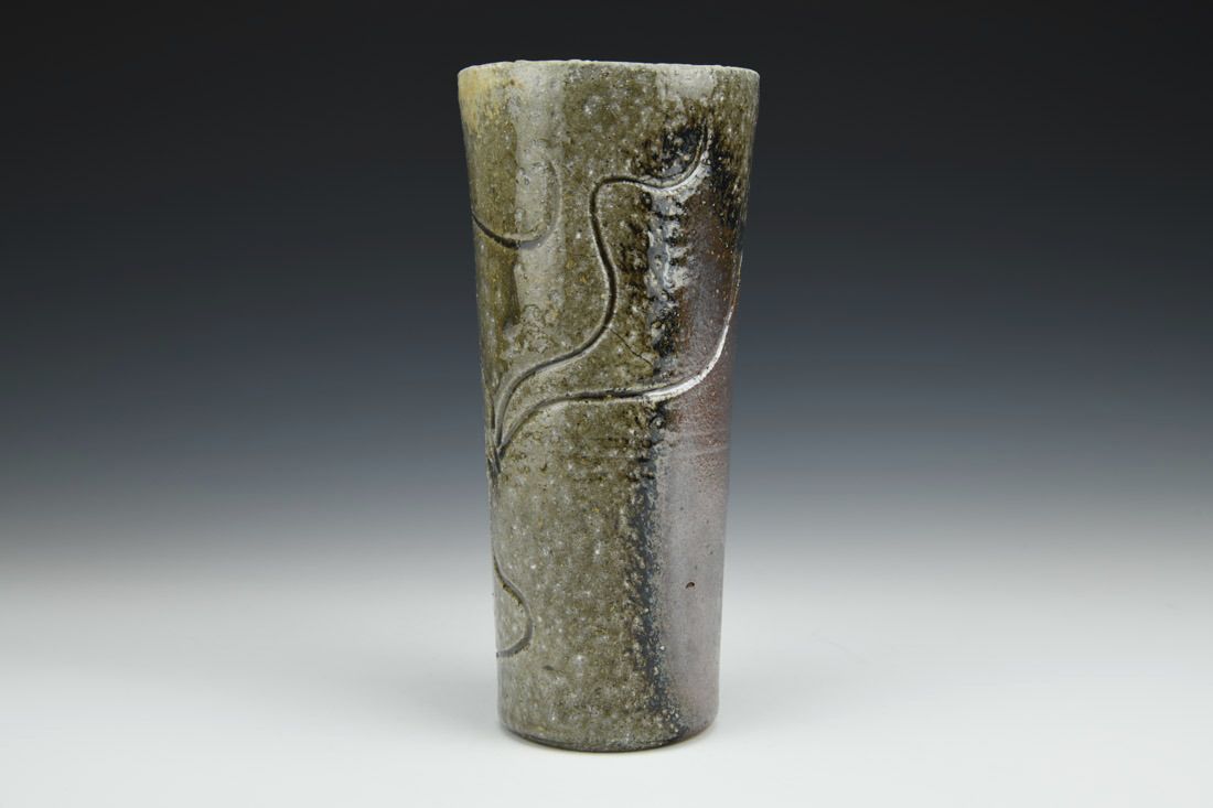 Raw North Carolina clay, wheel thrown, incised decoration, woodfired for 120 hours, 7.25 x 3.25 x 3.25 inches.