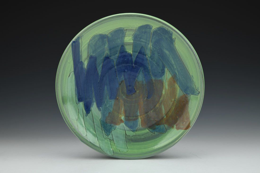 Red stoneware, wheel thrown, slip, underglaze, terra sigillata, glaze, cone 6 electric fired, 1.25 x 9 x 9 inches.