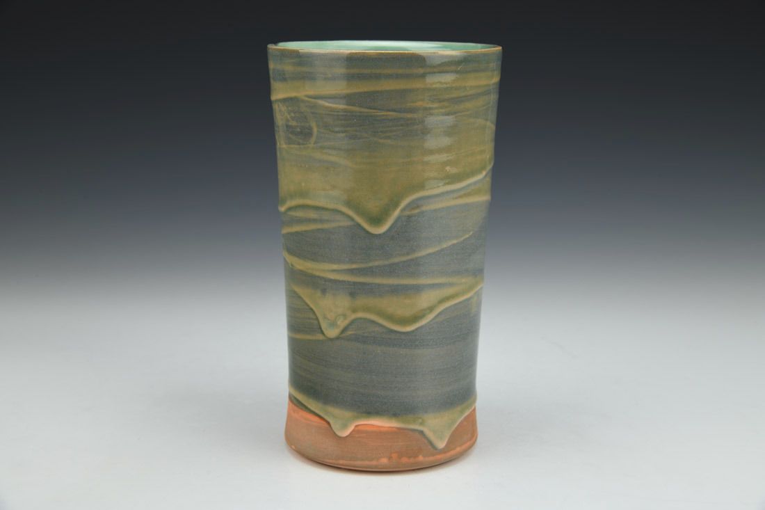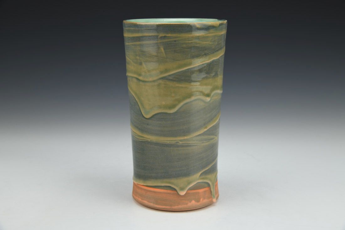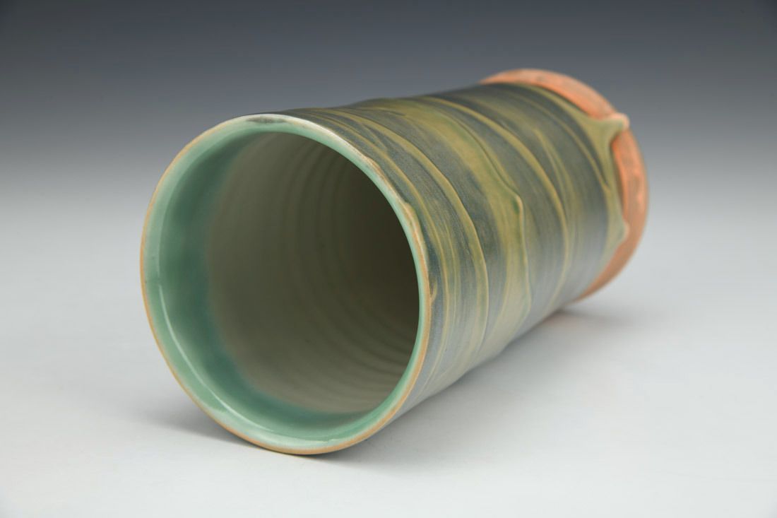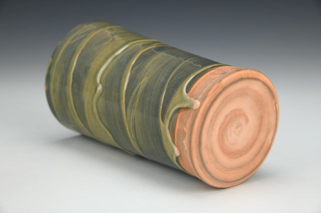 Red stoneware, wheel thrown, slip, underglaze, terra sigillata, glaze, cone 6 electric fired, 6.25 x 3.5 x 3.5 inches.