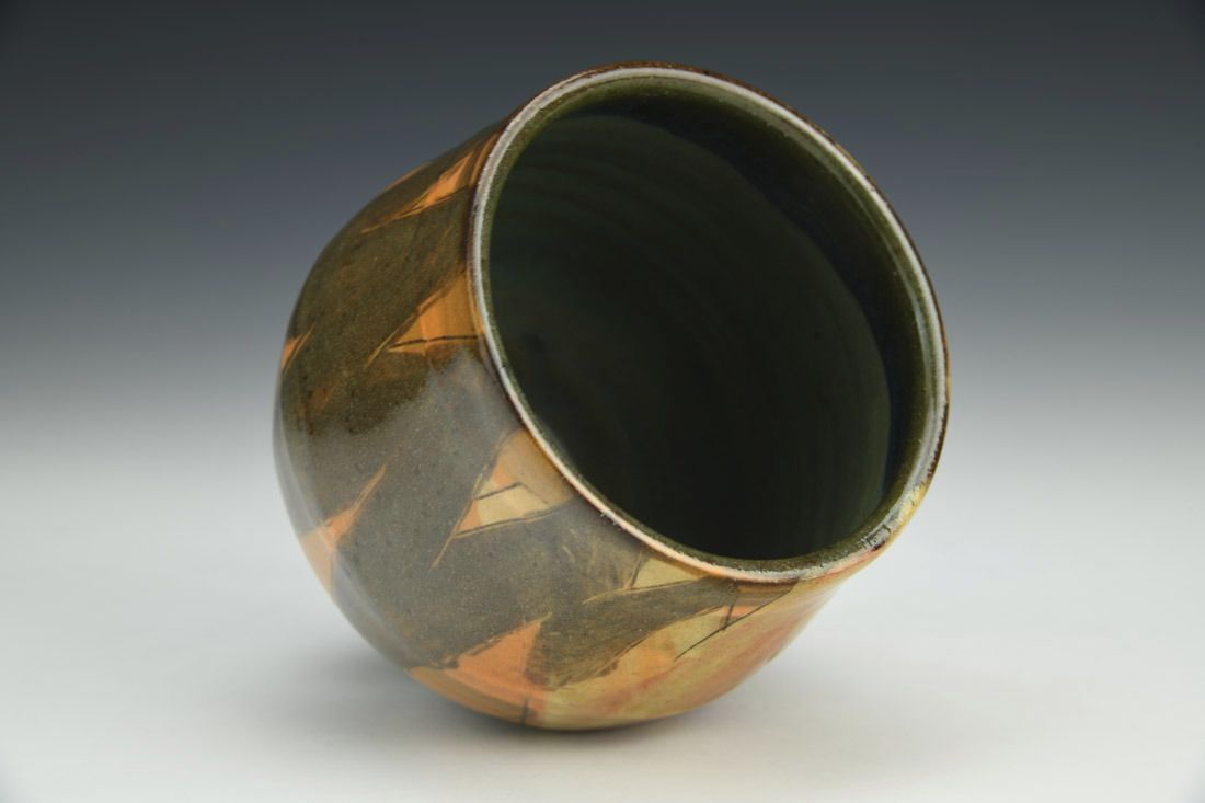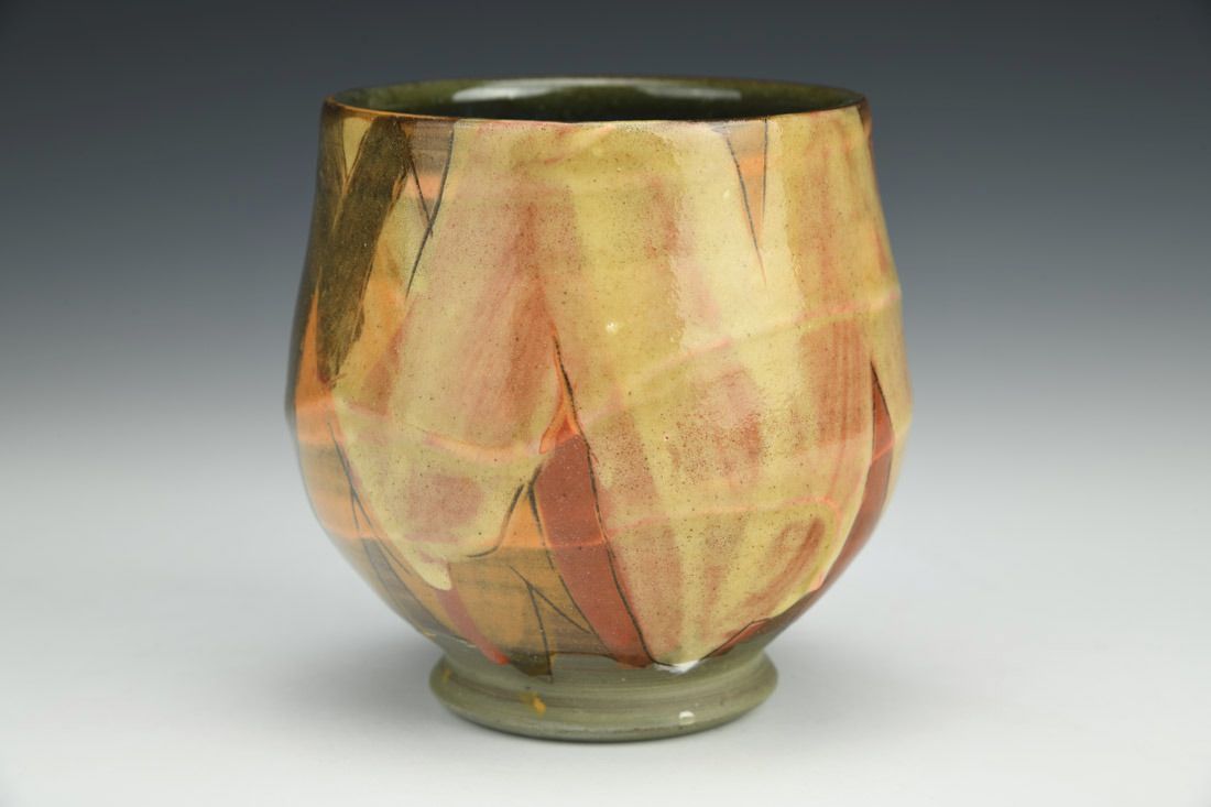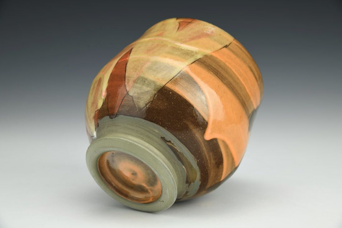 Red stoneware, wheel thrown, slips, terra sigillate, underglaze, glaze, cone 6 electric fired, 3.5 x 4 x 4 inches.