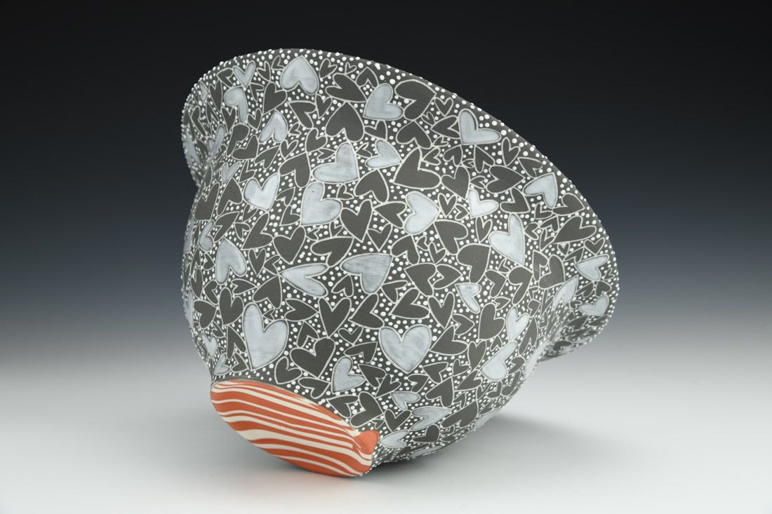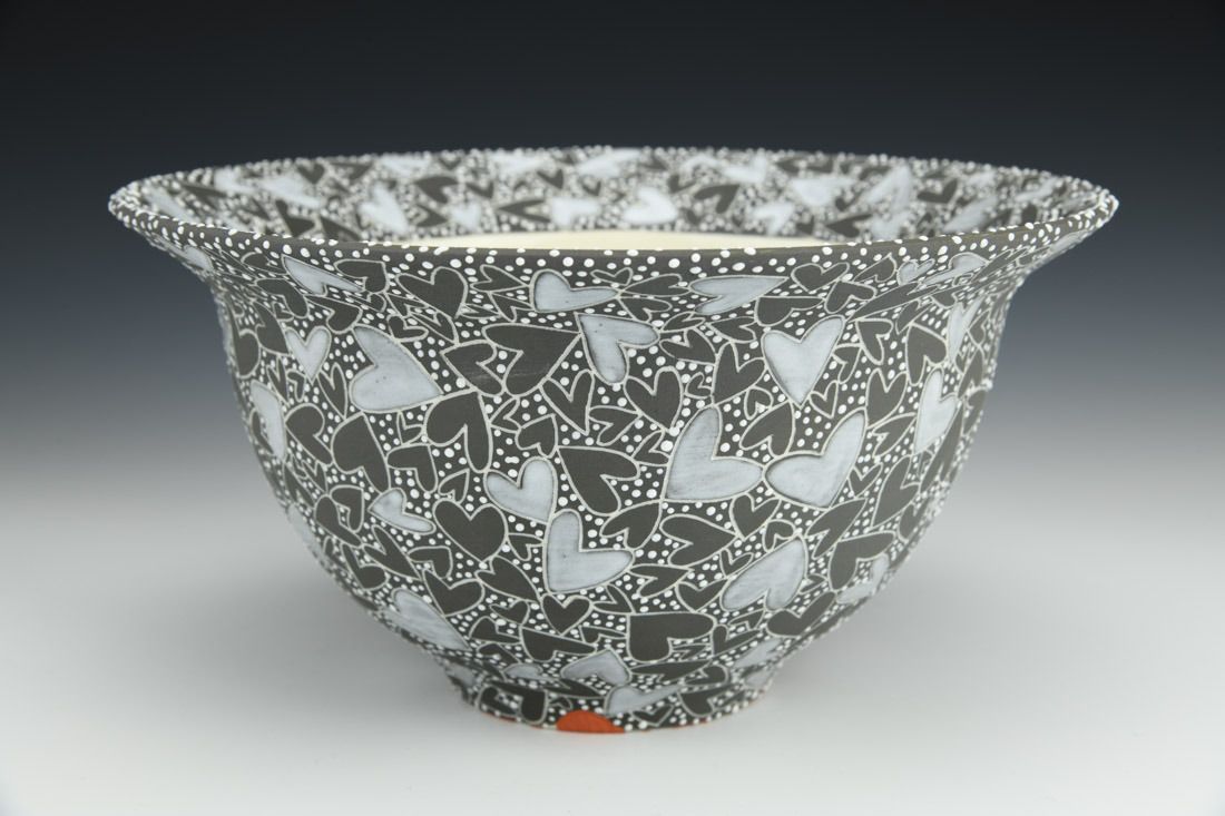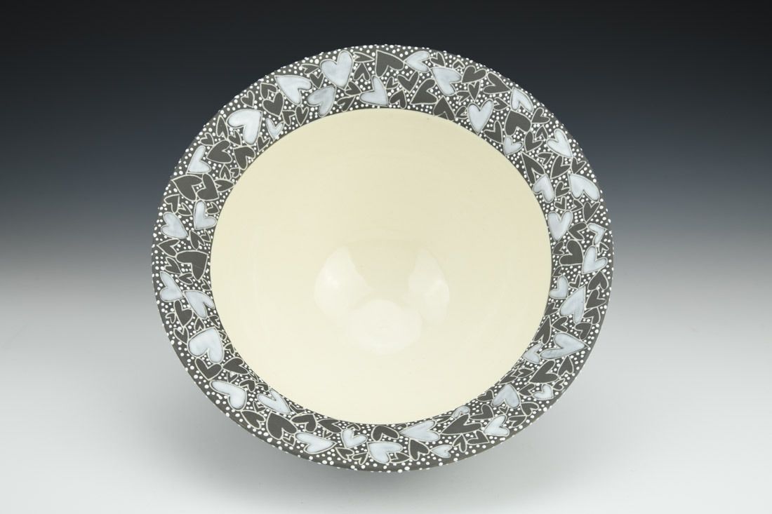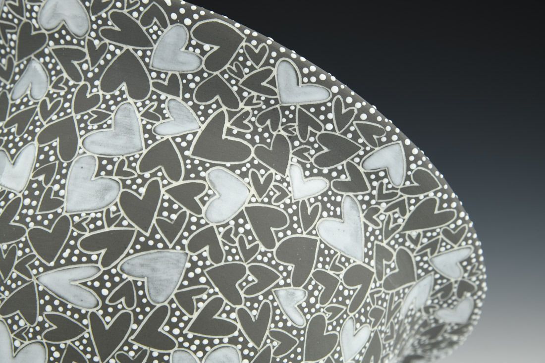 Porcelain, wheel thrown, sgrafitto, deep grey underglaze, glazes, cone 5 oxidation fired, 5 x 9.25 x 9.25 inches.