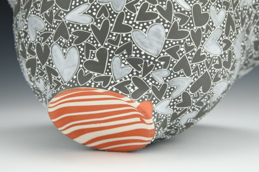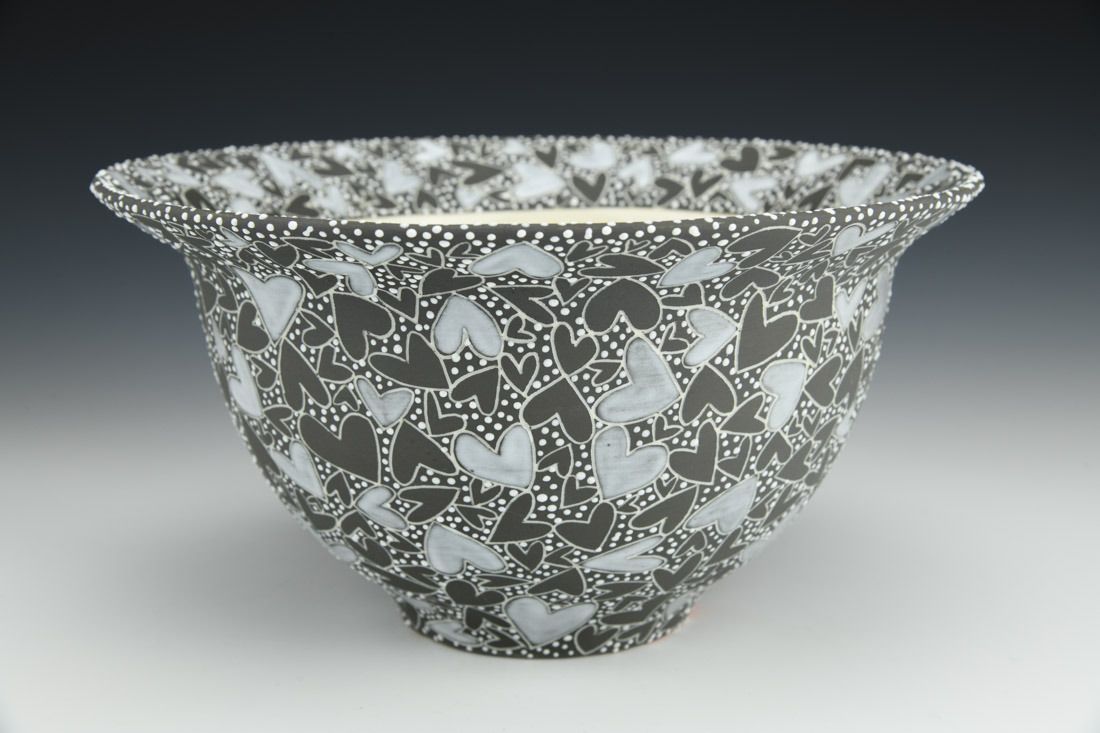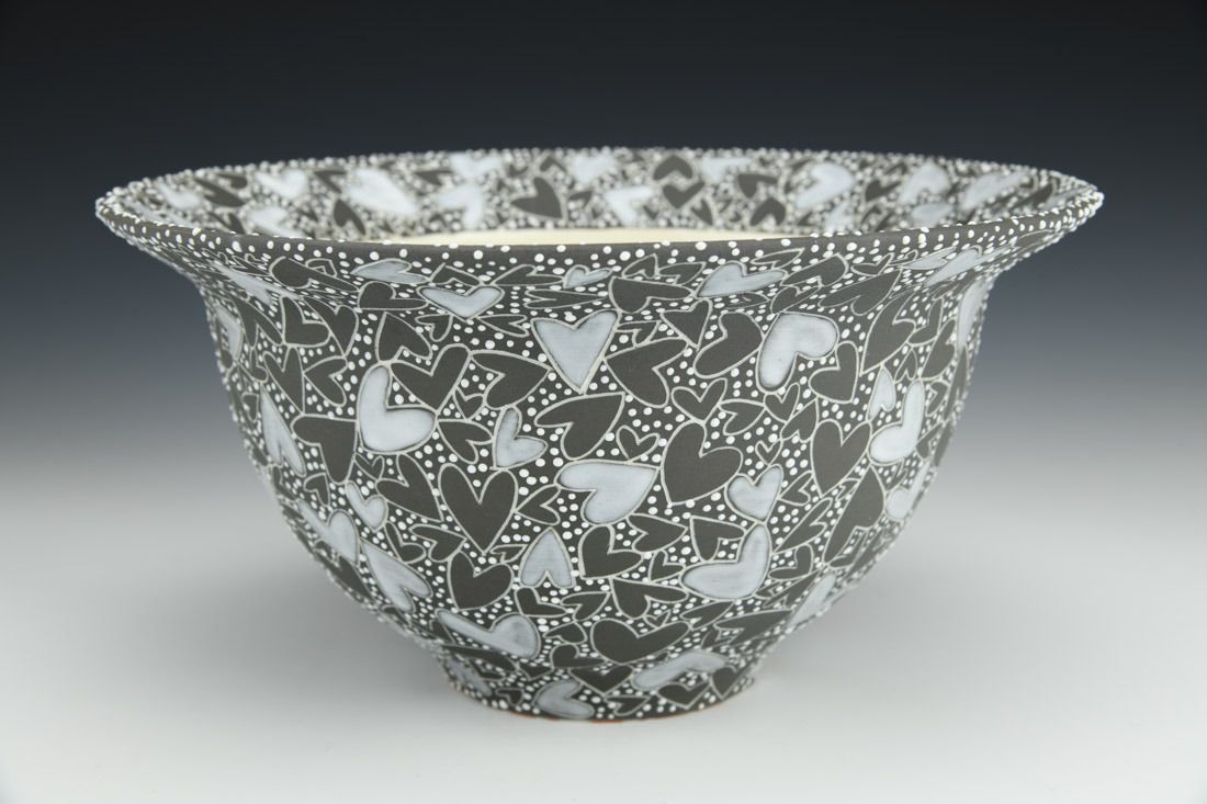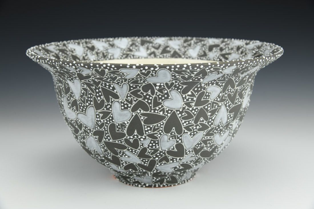 Porcelain, wheel thrown, sgrafitto, deep grey underglaze, glazes, cone 5 oxidation fired, 5 x 9.25 x 9.25 inches.