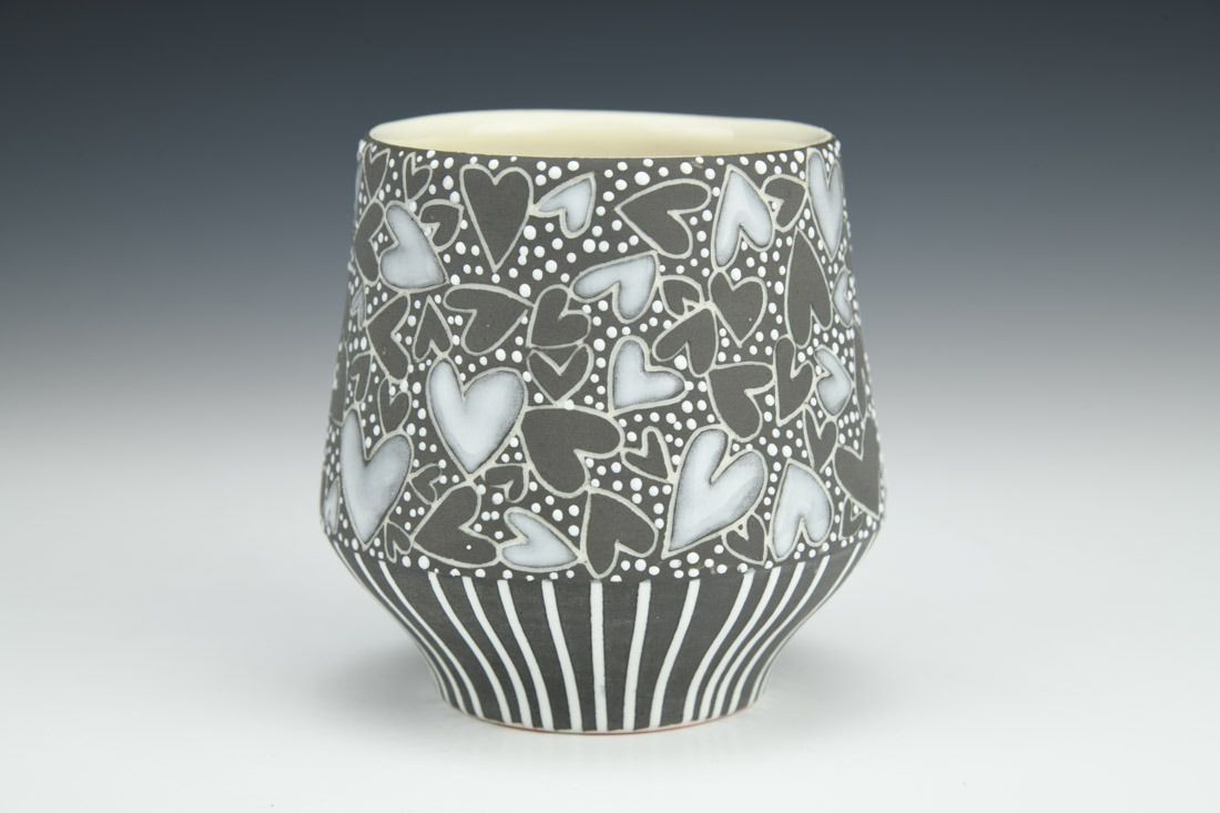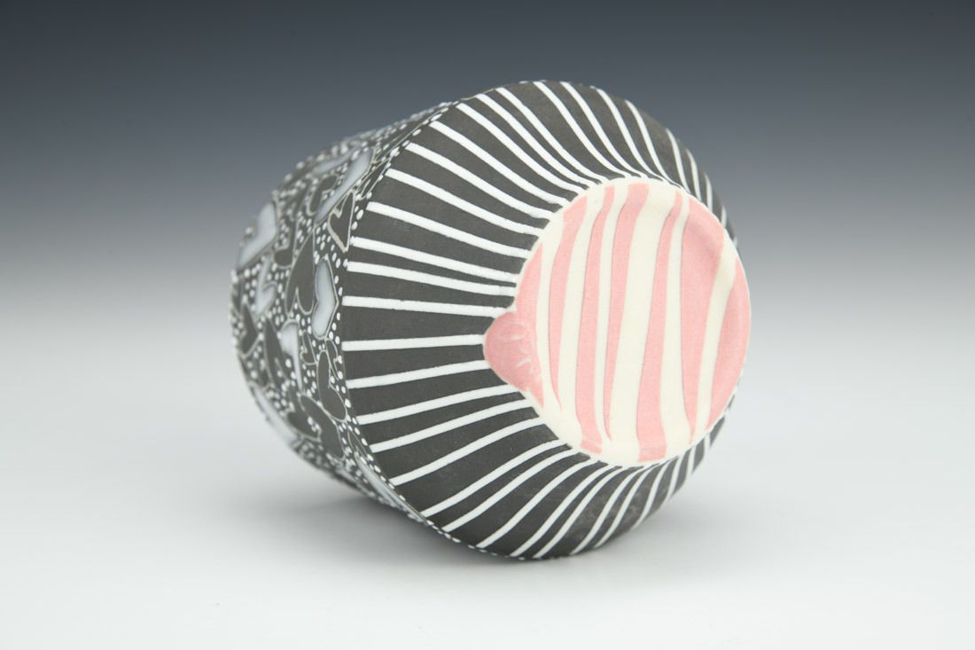 Porcelain, wheel thrown, sgrafitto, deep grey underglaze, glazes, cone 5 oxidation fired, 3.5 x 3.5 x 3.5 inches.