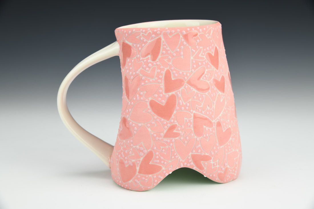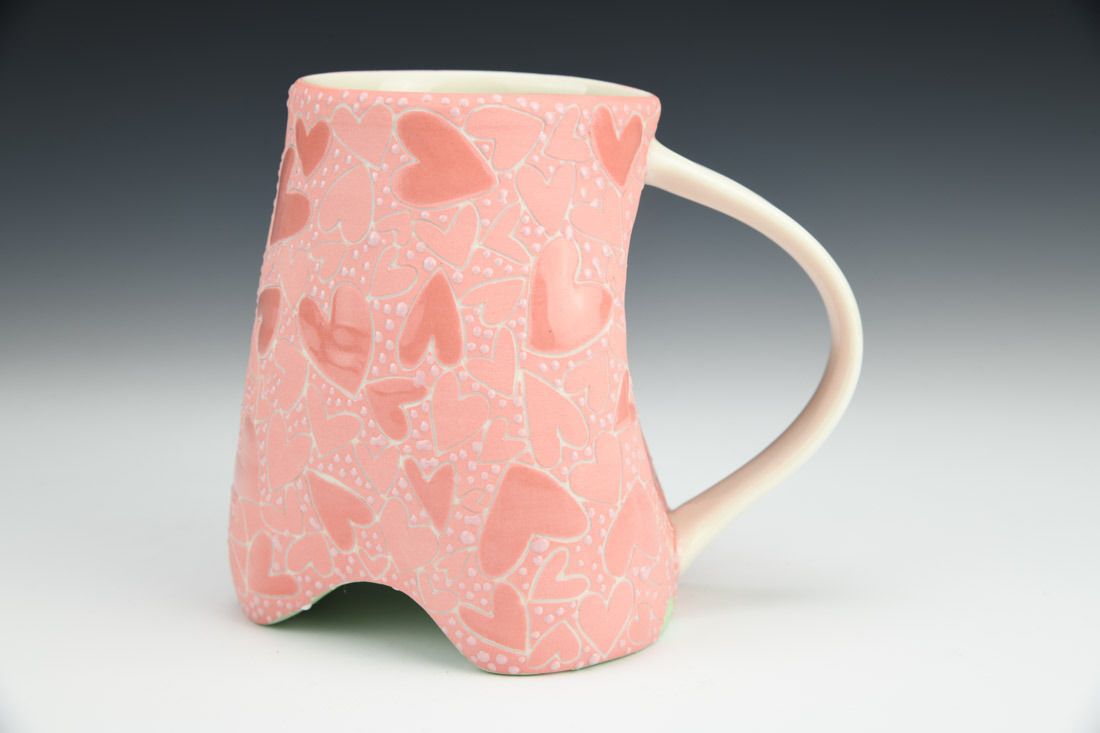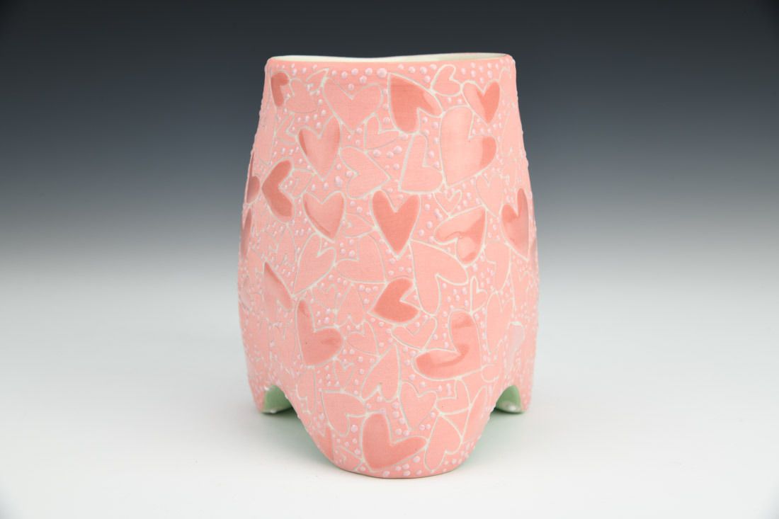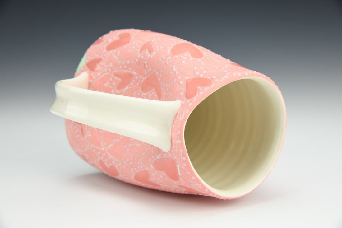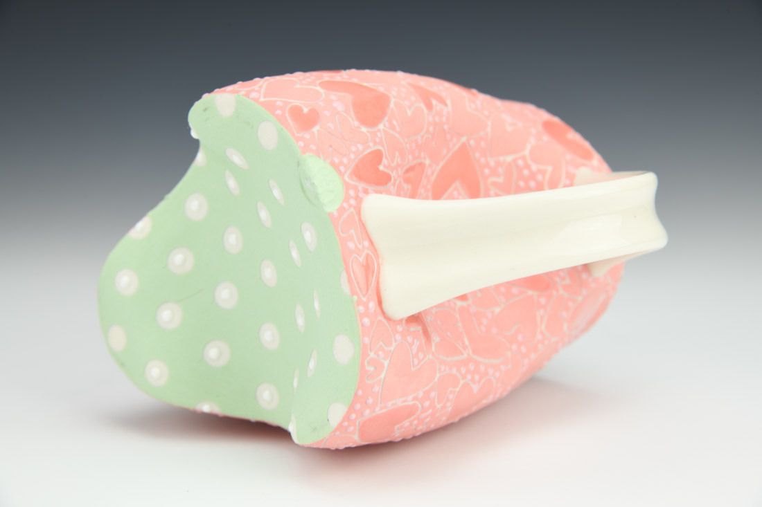 Porcelain, wheel thrown and altered, sgrafitto, pink underglaze, glazes, cone 5 oxidation fired, 4.75 x 5.25 x 3.75 inches.