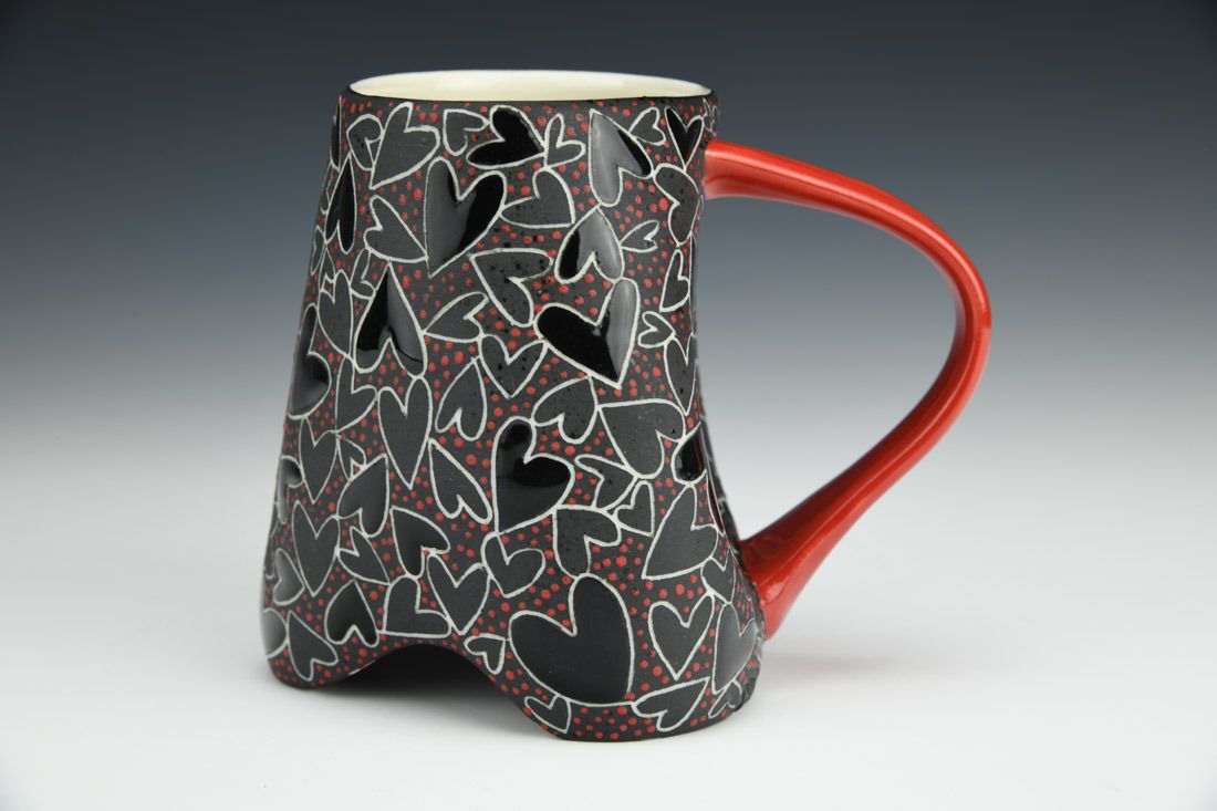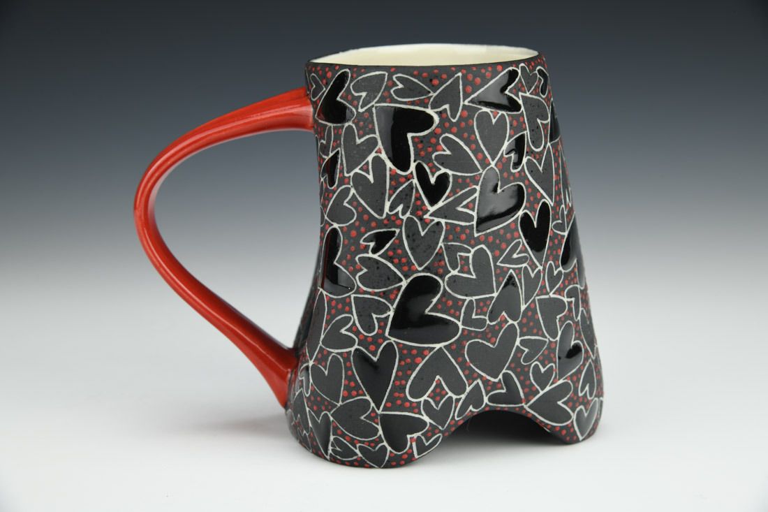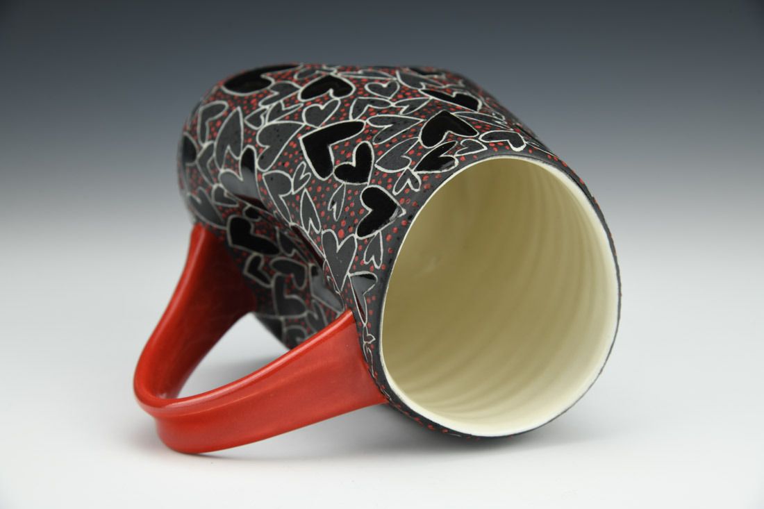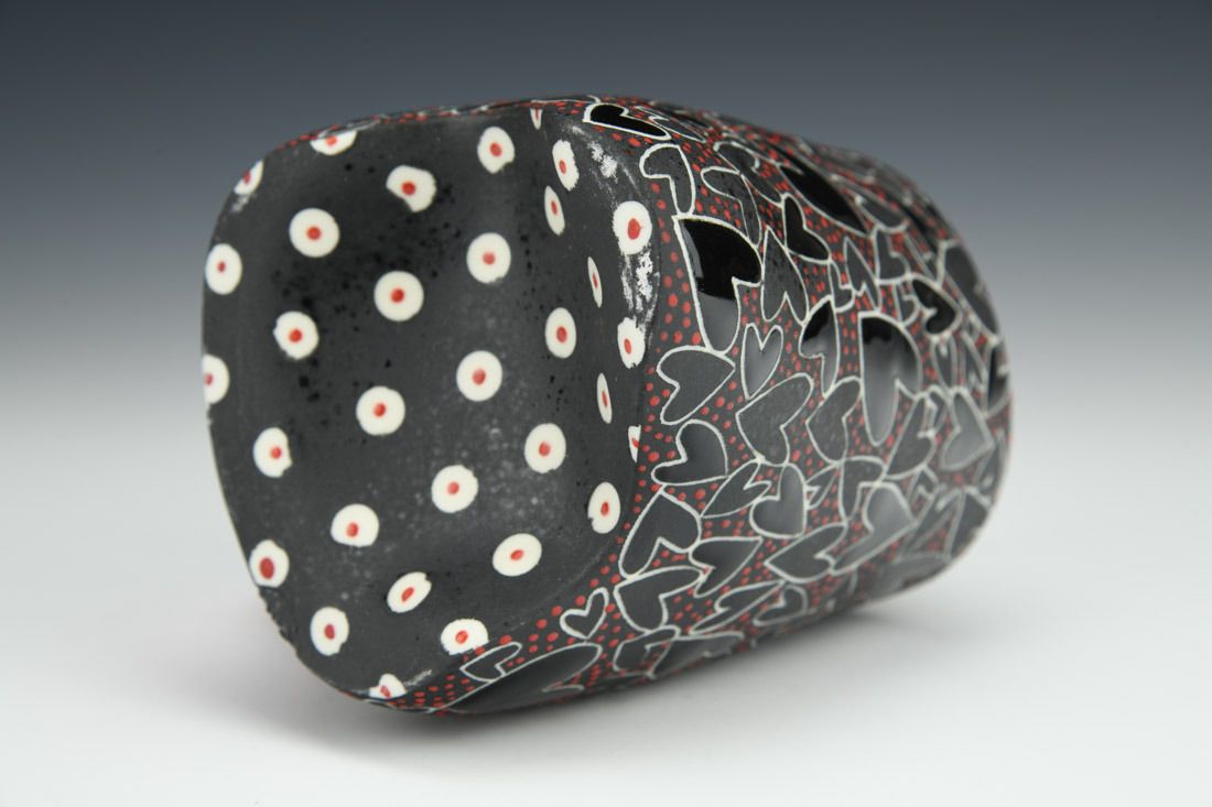 Porcelain, wheel thrown and altered, sgrafitto, jet black underglaze, glazes, cone 5 oxidation fired, 4.5 x 5.5 x 3.75 inches.