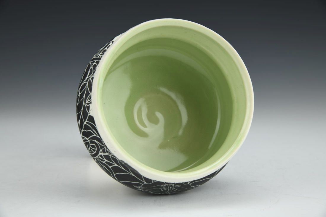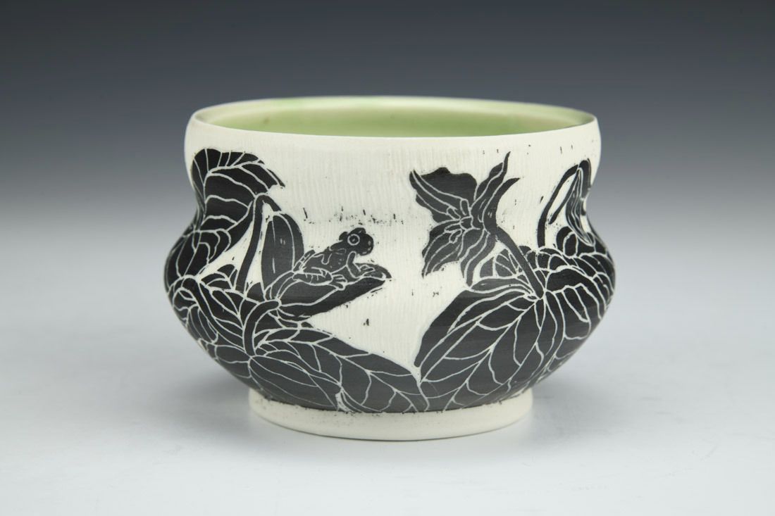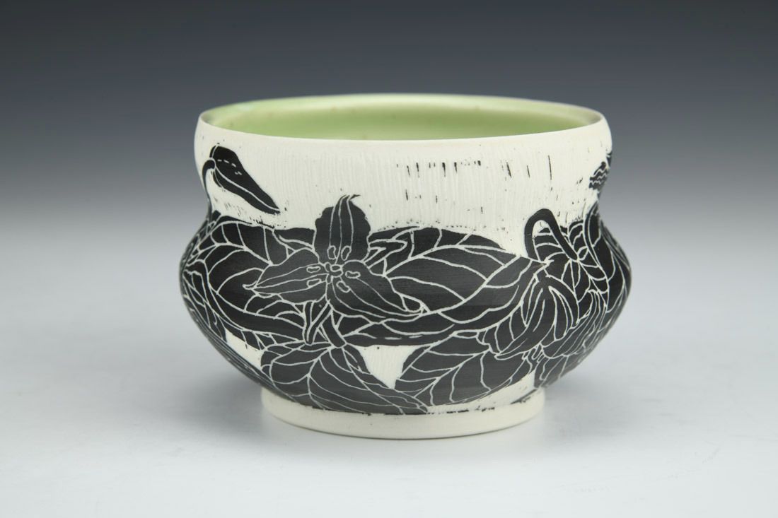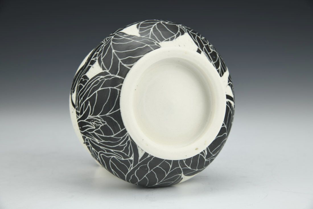 Porcelain, wheel thrown, sgraffito, underglaze, cone 10 fired, 2.75 x 4 x 4 inches.