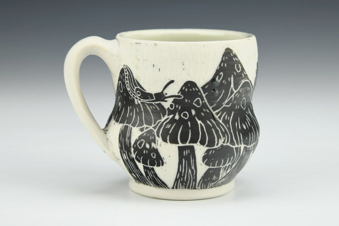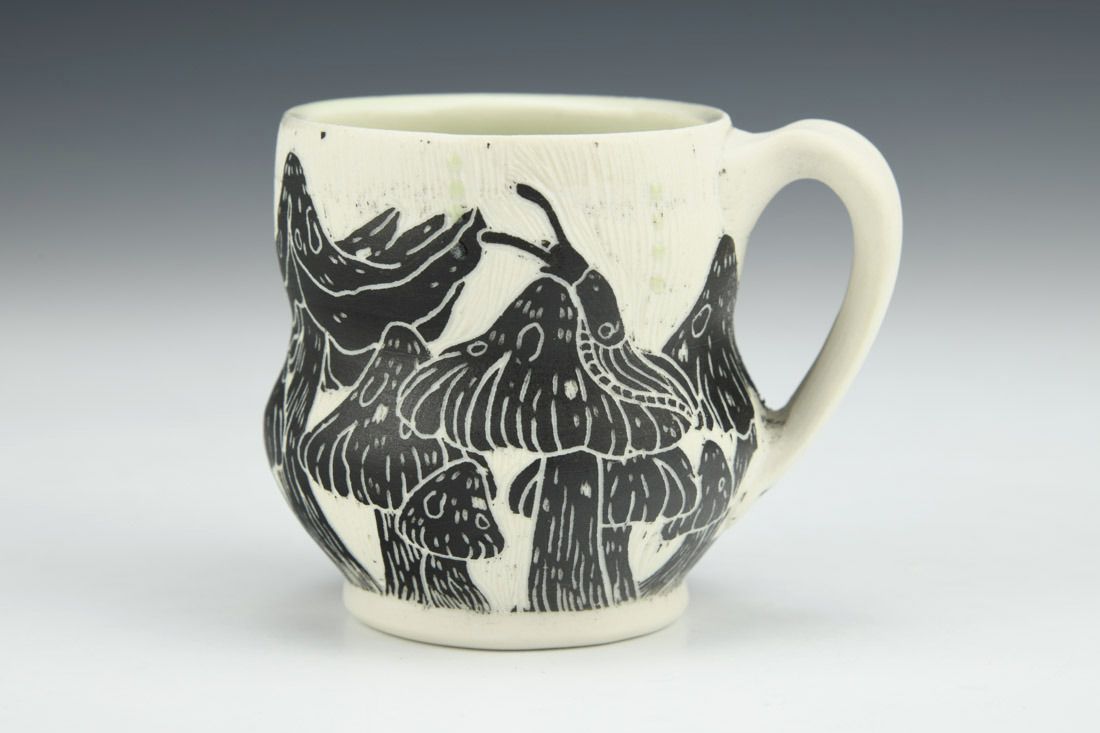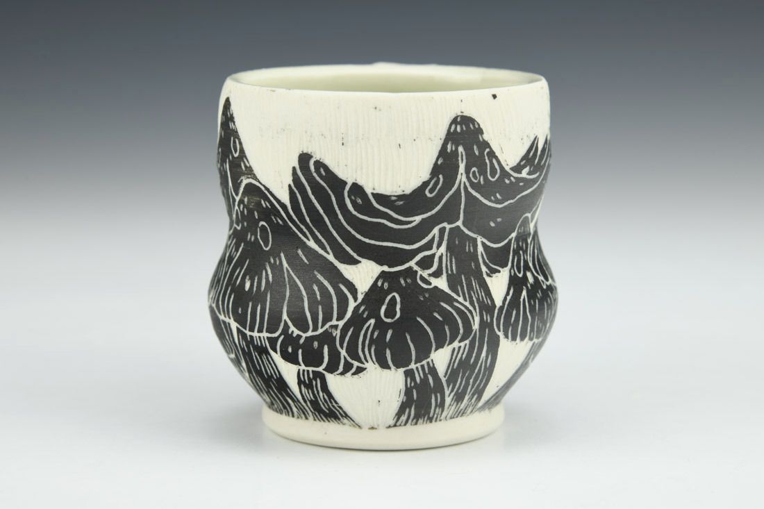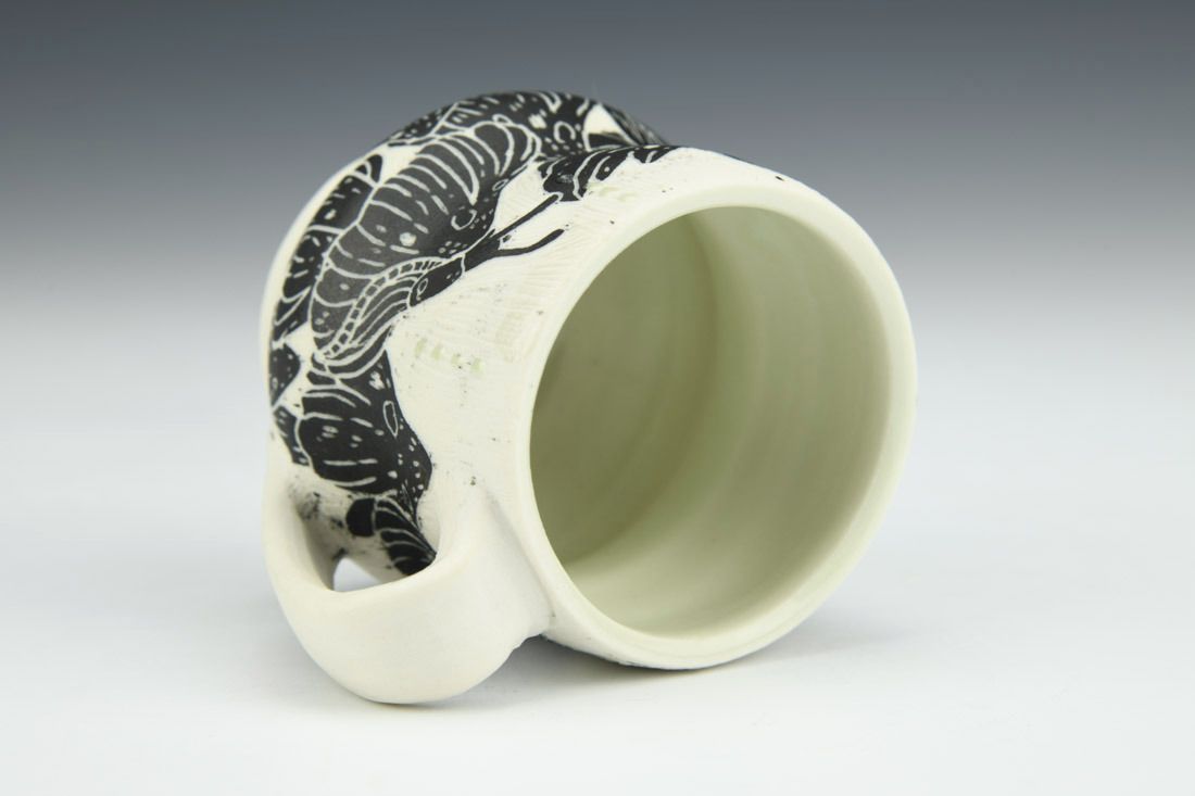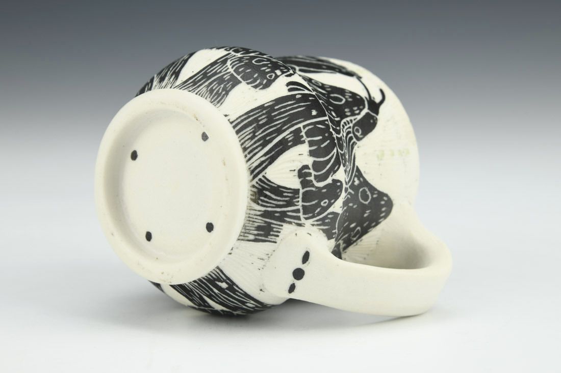 Porcelain, wheel thrown, sgraffito, cone 10 fired, 2.5 x 3.5 x 2.75 inches.